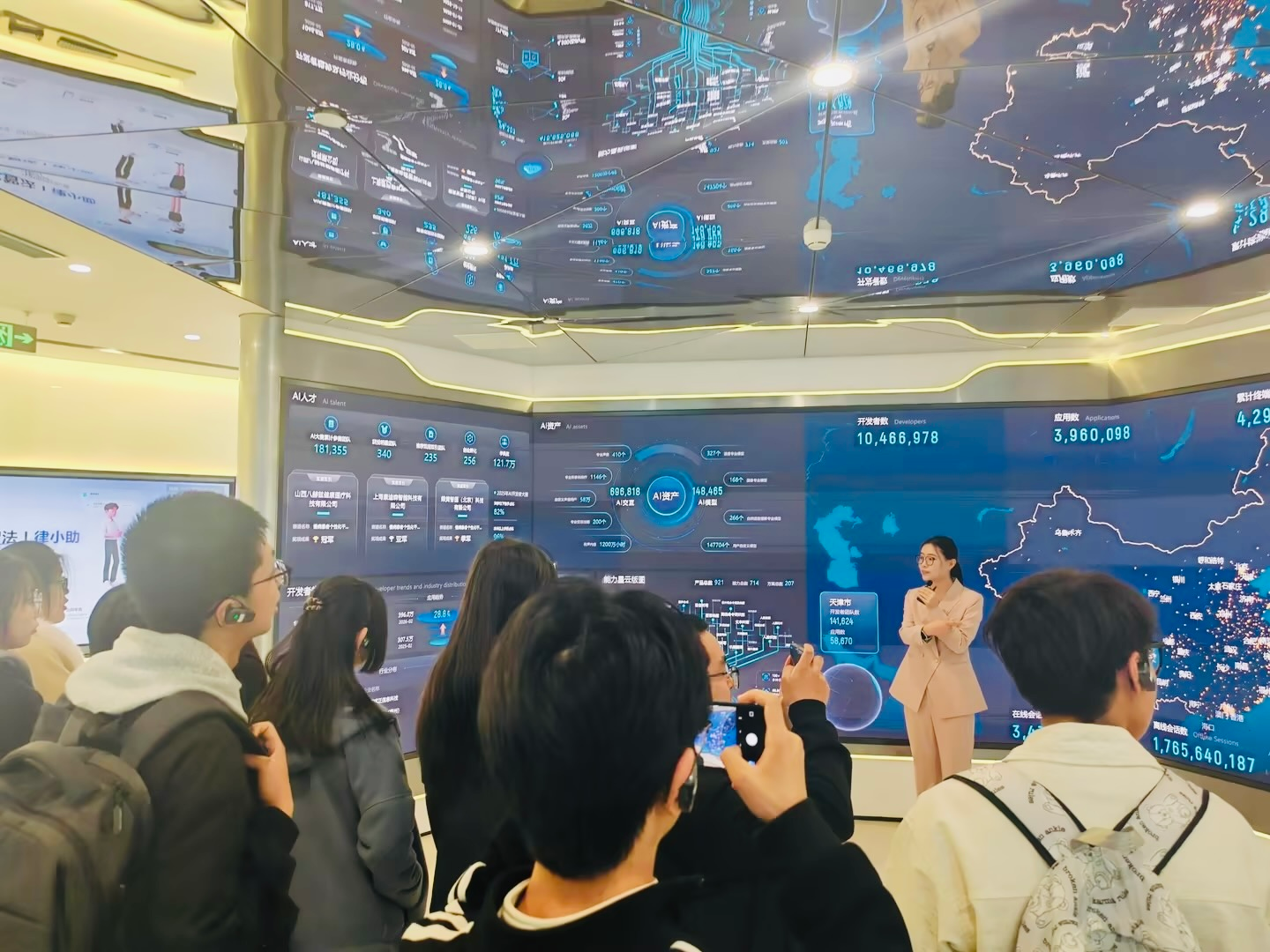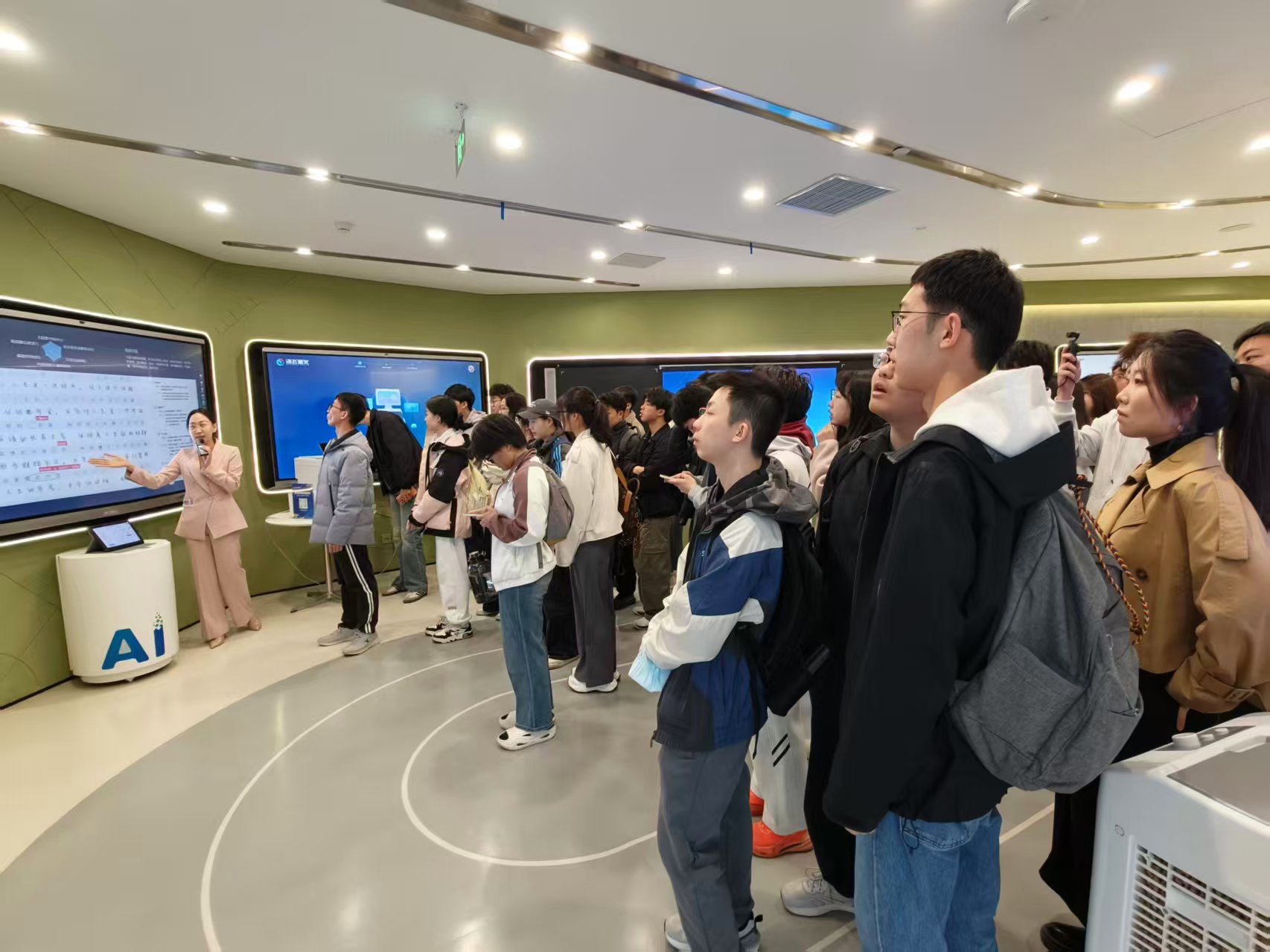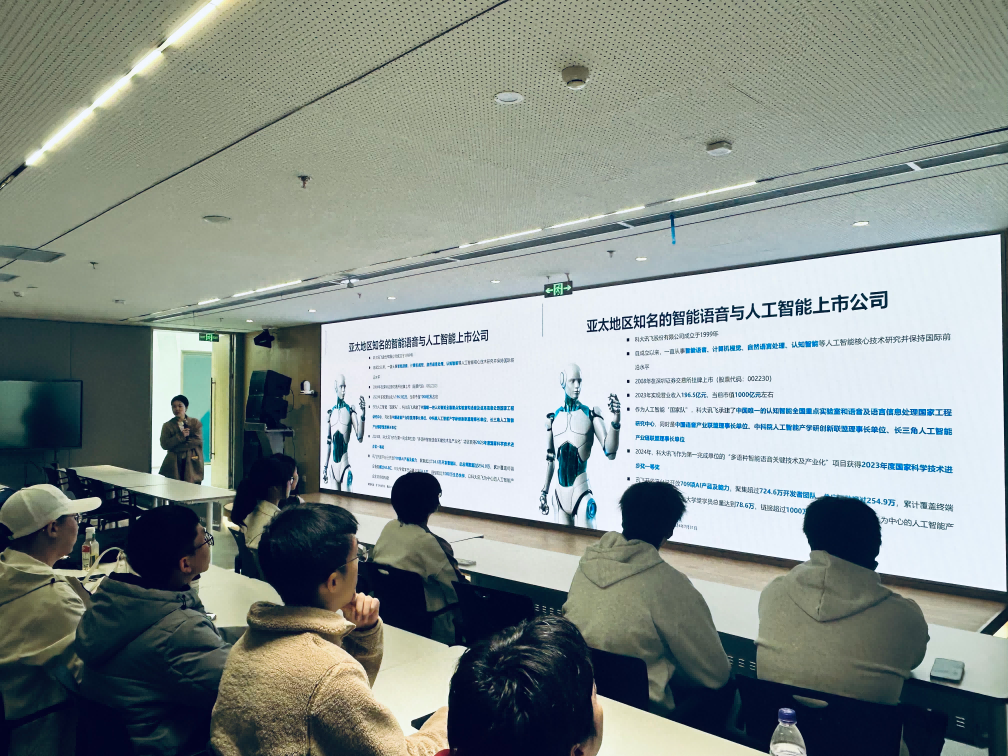 在科大讯飞工作人员的带领下,同学们首先走进人工智能体验馆,沉浸式感受AI技术落地成果。展厅内,讯飞星火大模型、智慧教育AI黑板、智能翻译设备、虚拟人交互、智慧医疗辅助系统等前沿产品依次呈现,全面展示了科大讯飞在语音识别、认知智能、多语种翻译等核心技术的自主研发实力,以及在多领域的规模化应用场景。通过互动交流,同学们直观见证人工智能从技术研发到产业落地的完整生态,深刻体会AI技术赋能千行百业的强大动能。