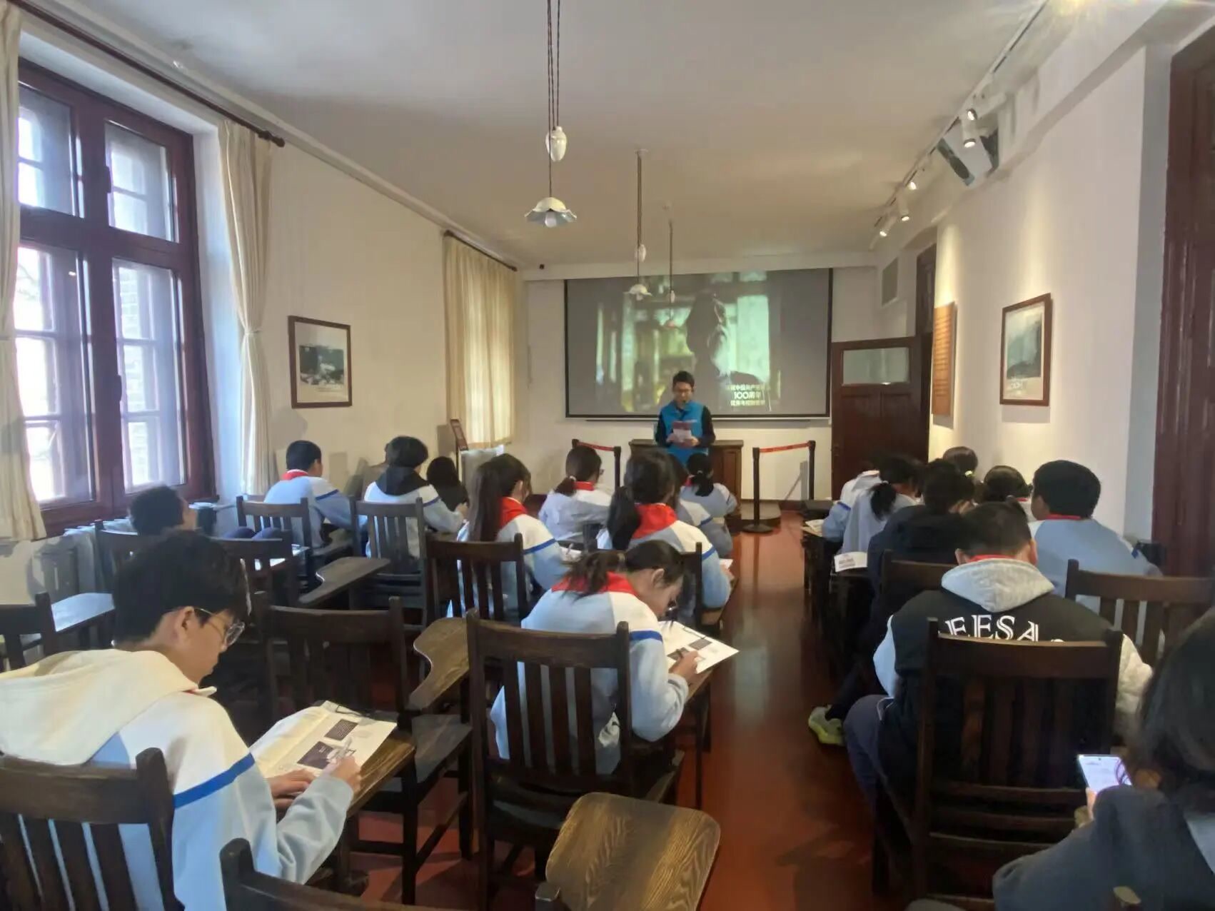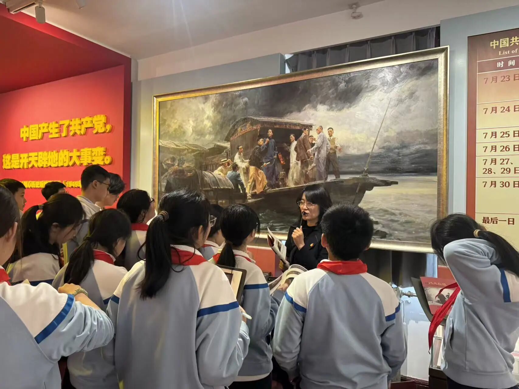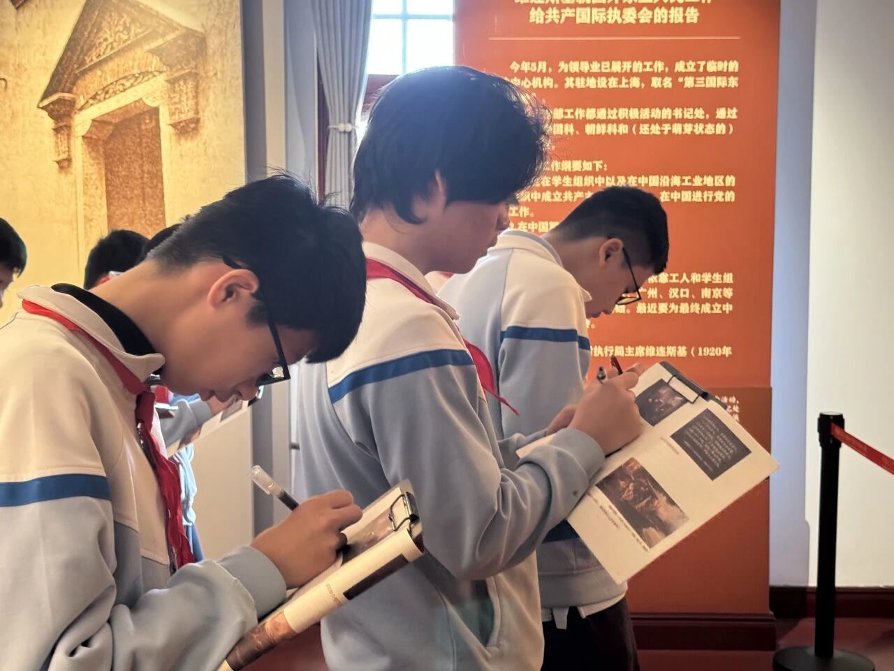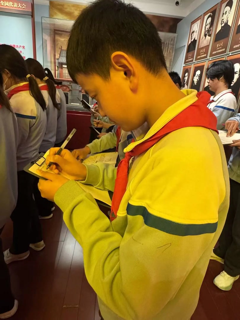 同学们认真聆听讲解、仔细填写学案,主动交流感悟,在一个个历史细节中接受精神洗礼,实现从“看”展览到“思”历史的转变,让伟大建党精神入脑入心。