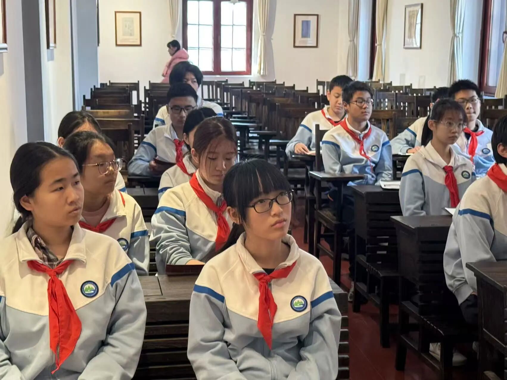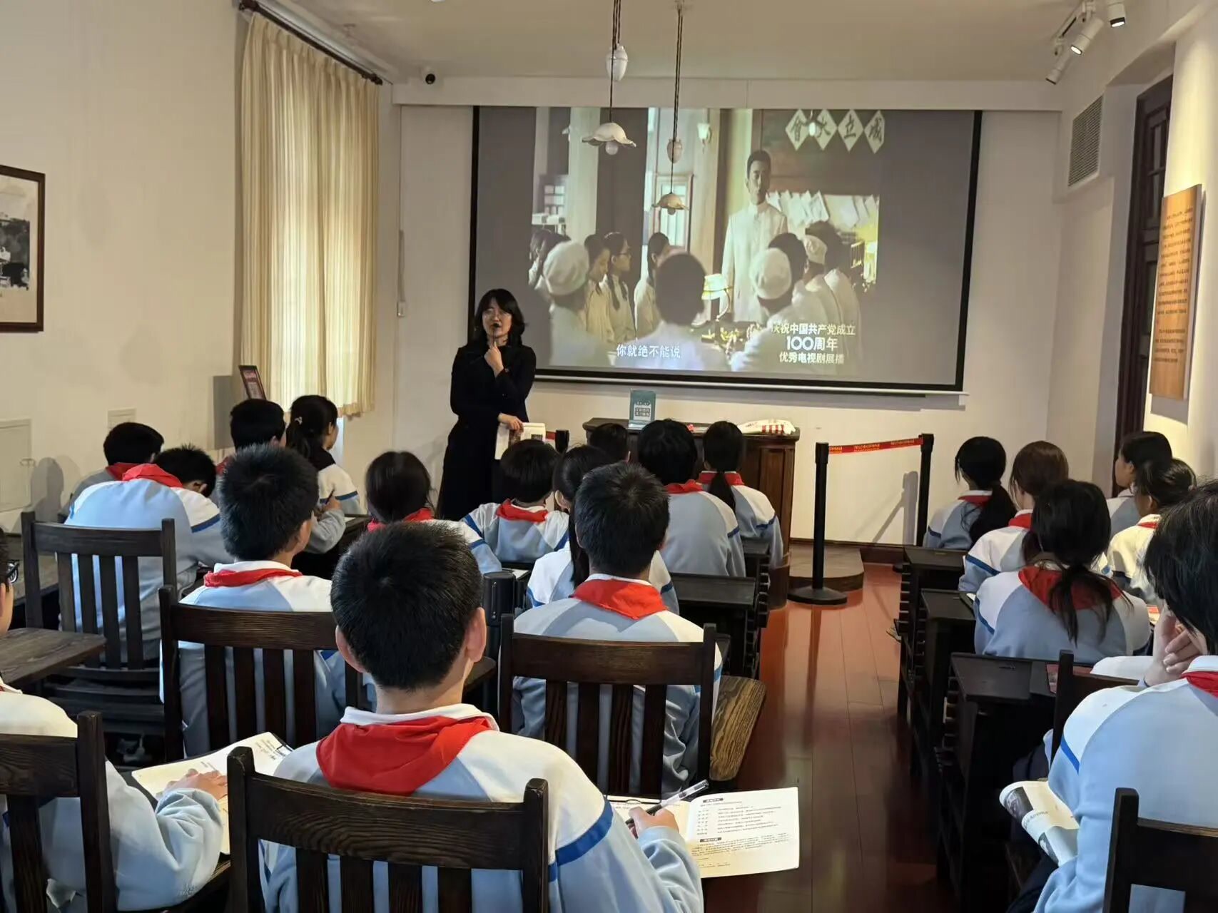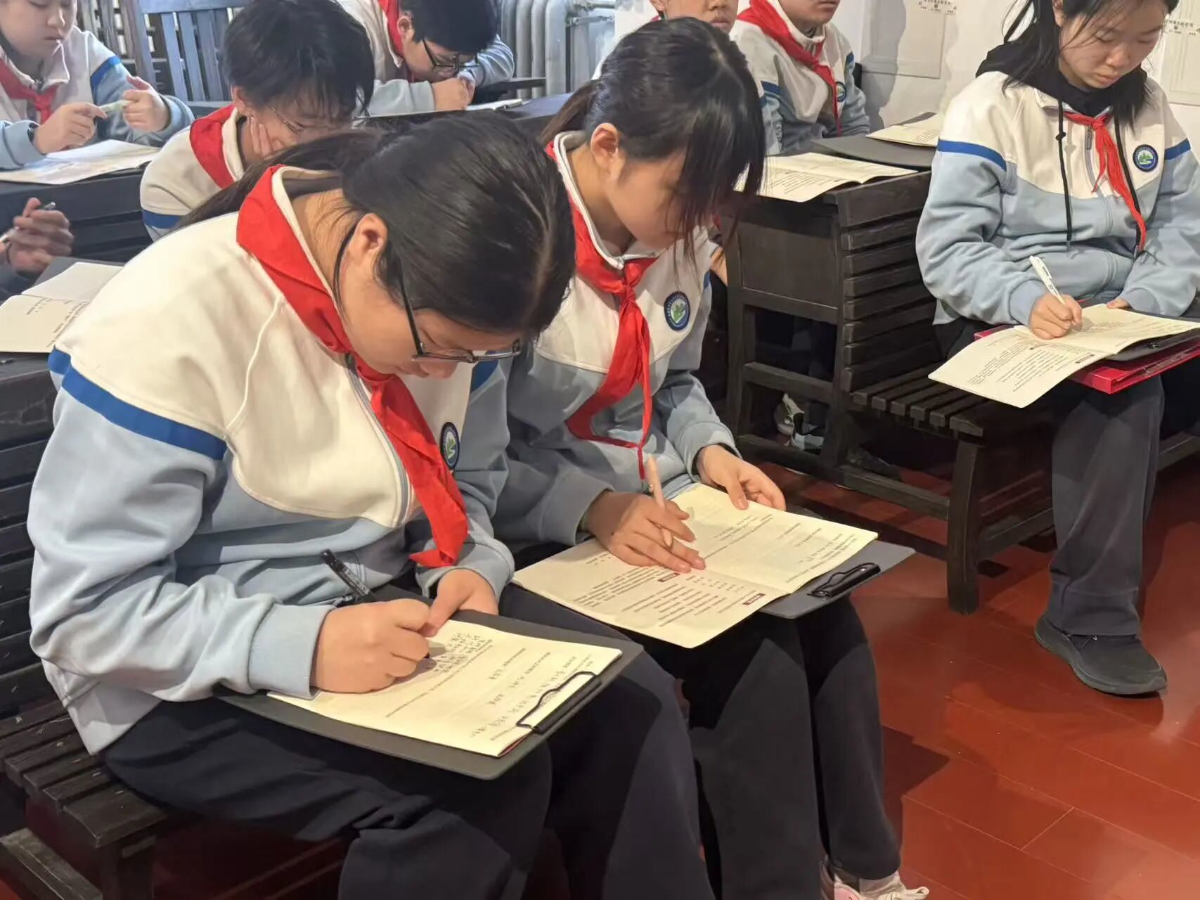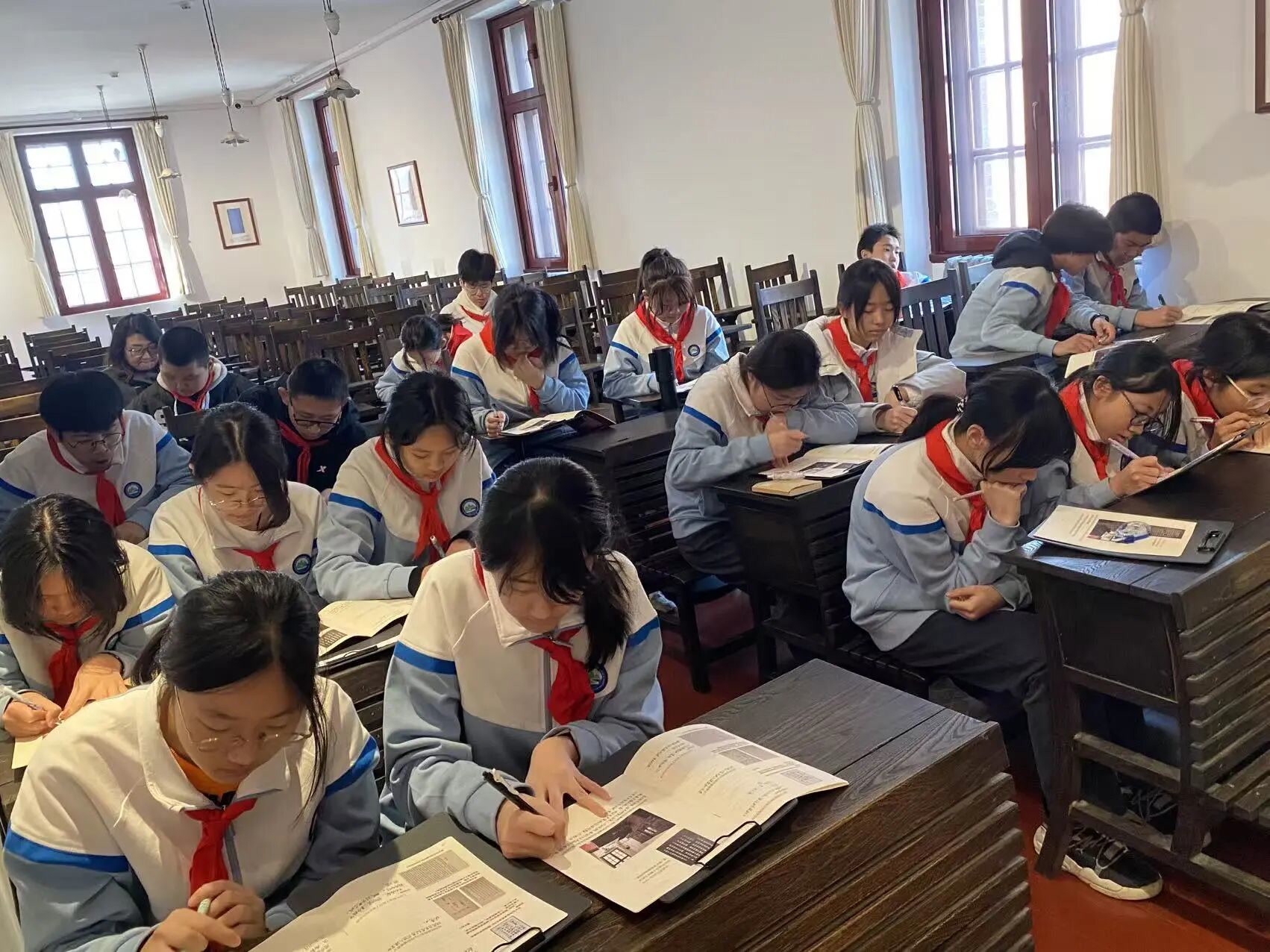 同学们认真聆听讲解、仔细填写学案,主动交流感悟,在一个个历史细节中接受精神洗礼,实现从“看”展览到“思”历史的转变,让伟大建党精神入脑入心。