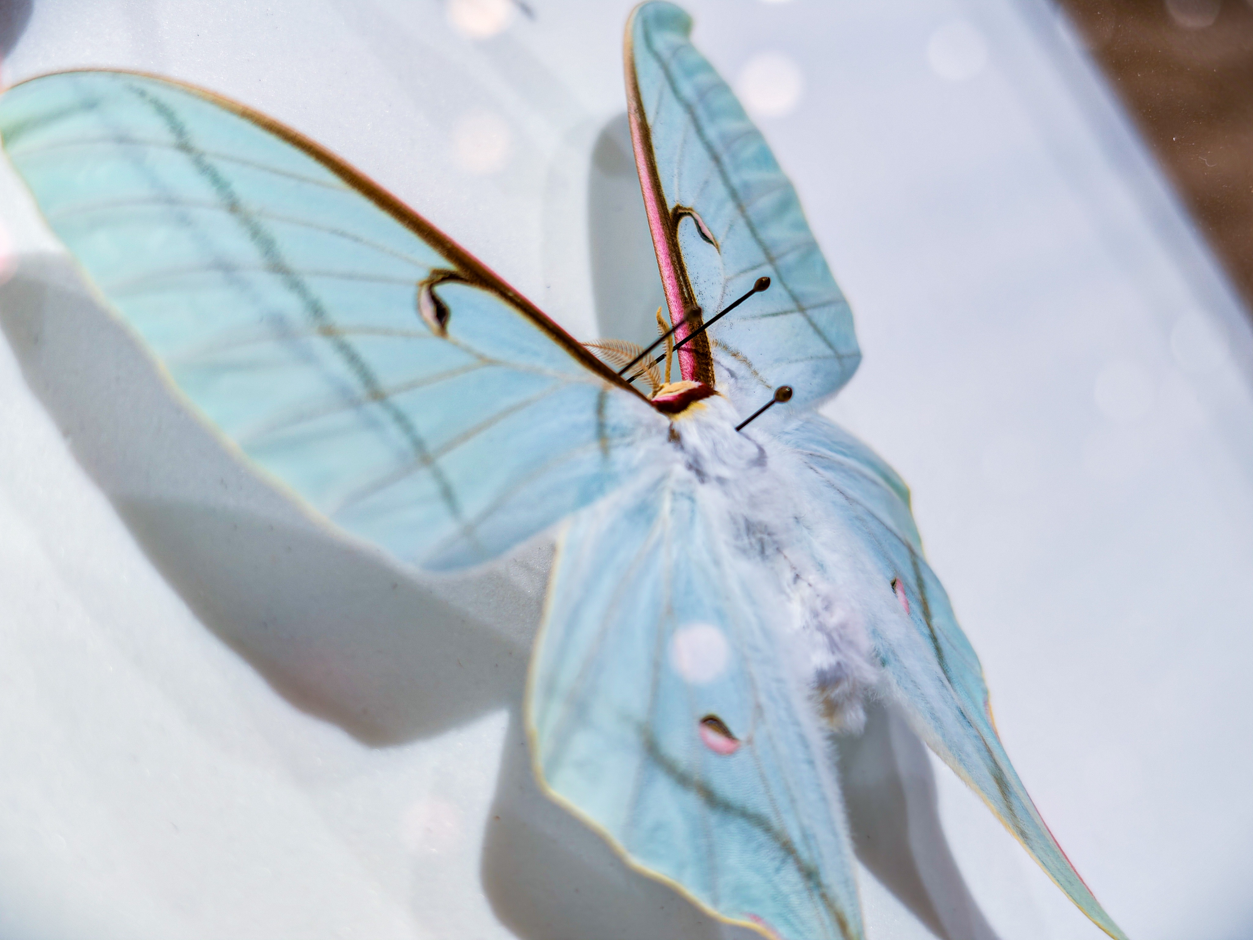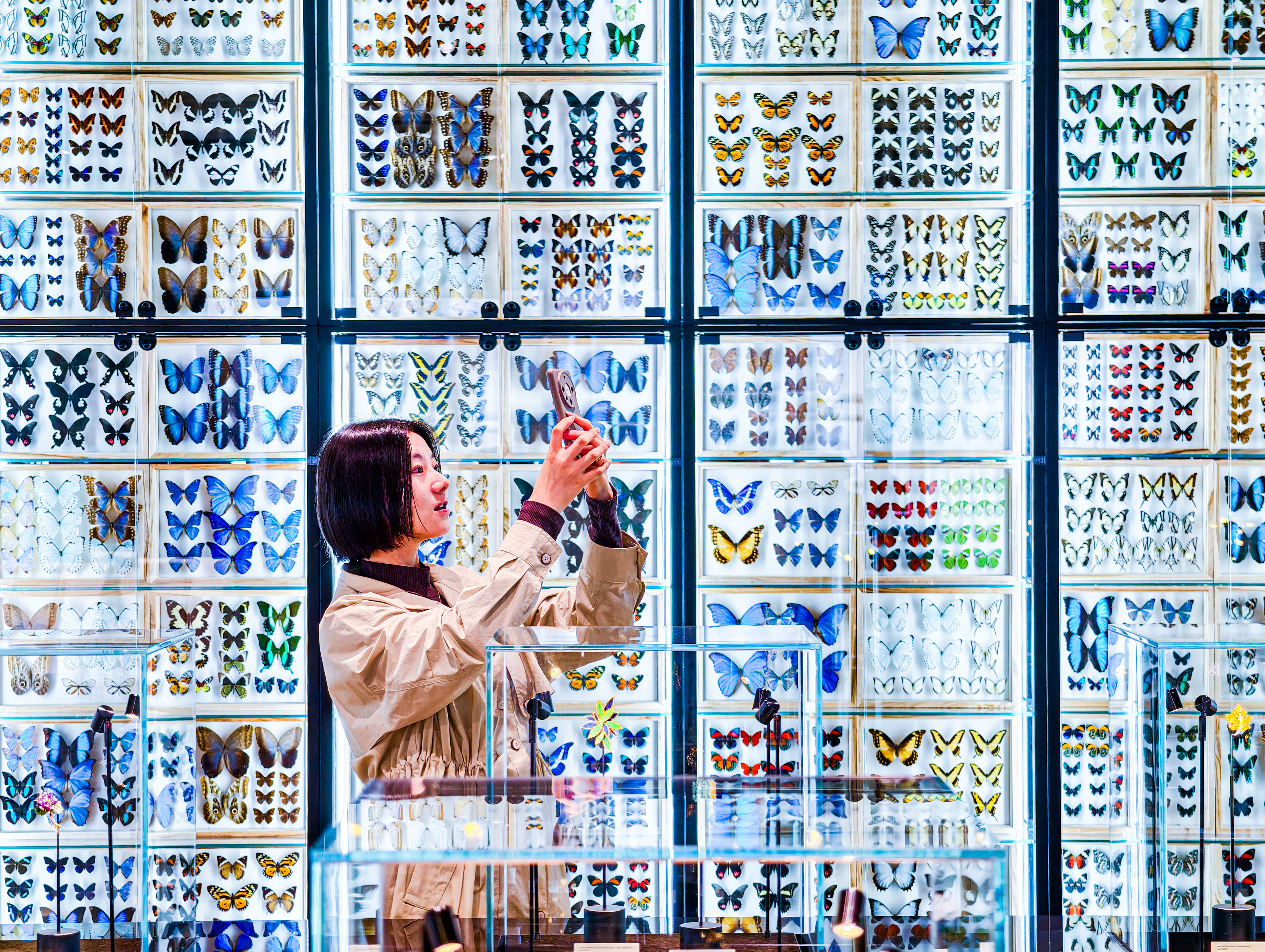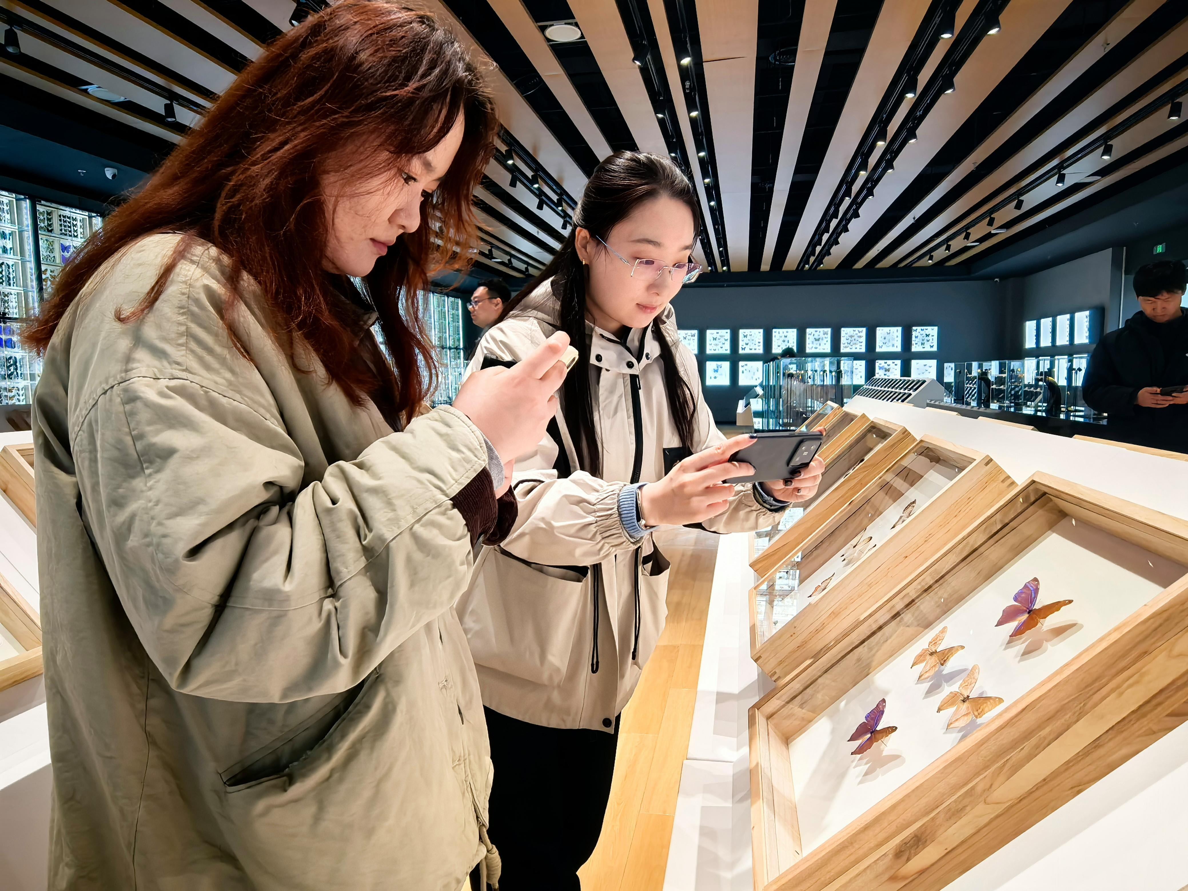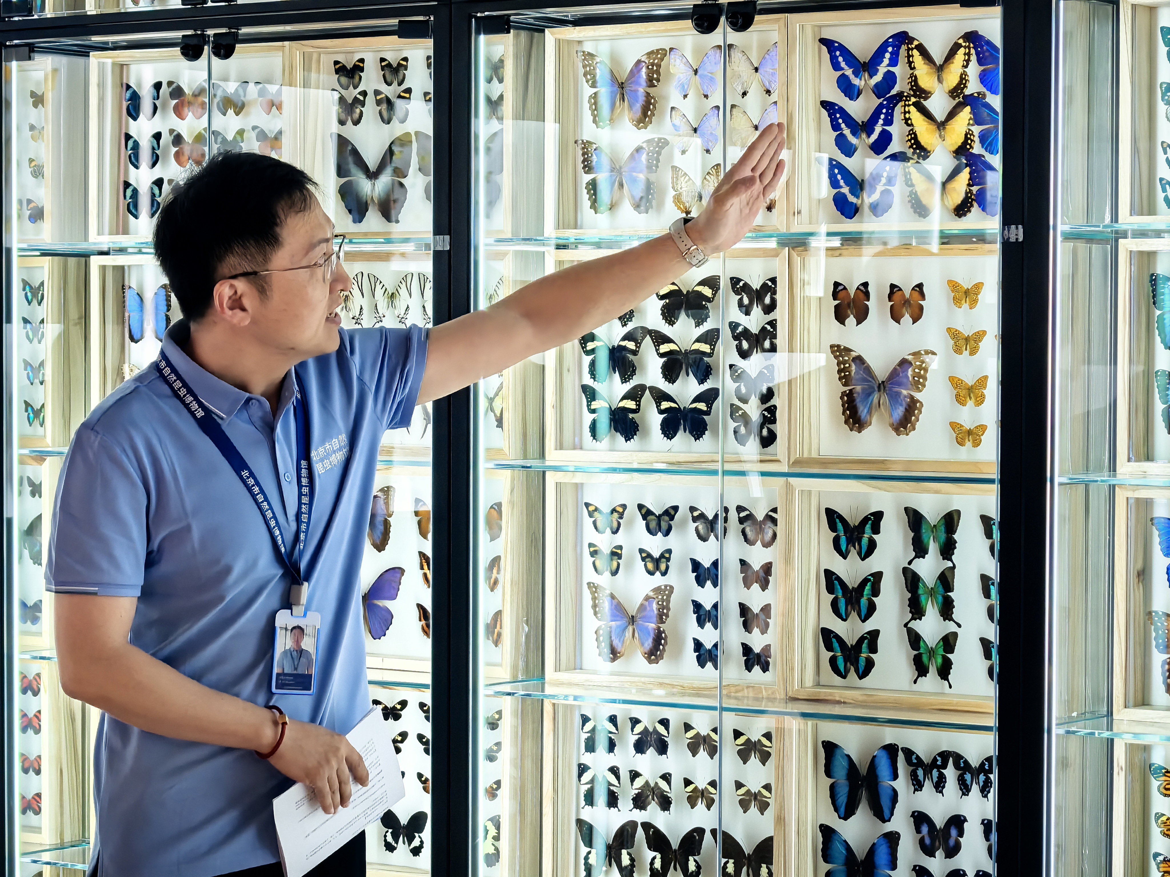 走进博物馆,极具视觉冲击力的蝴蝶墙和琳琅满目的昆虫标本尽收眼底。炫彩夺目的大蓝闪蝶、伪装巧妙的枯叶蝶、深邃难辨的猫头鹰环蝶、优雅从容的君主斑蝶……近万只来自全球不同地域、拥有不同色彩、不同翅脉结构的蝴蝶标本整齐排列,当灯光打在翅膀上时,透过玻璃折射出梦幻般的光泽。“这是我第一次看到如此多品种的蝴蝶,一眼望去十分壮观,美丽看似是短暂的,但也是最持久的。”市民艾女士站在蝴蝶墙前打卡时感慨道。