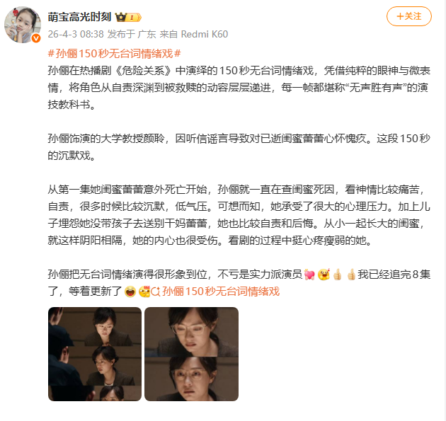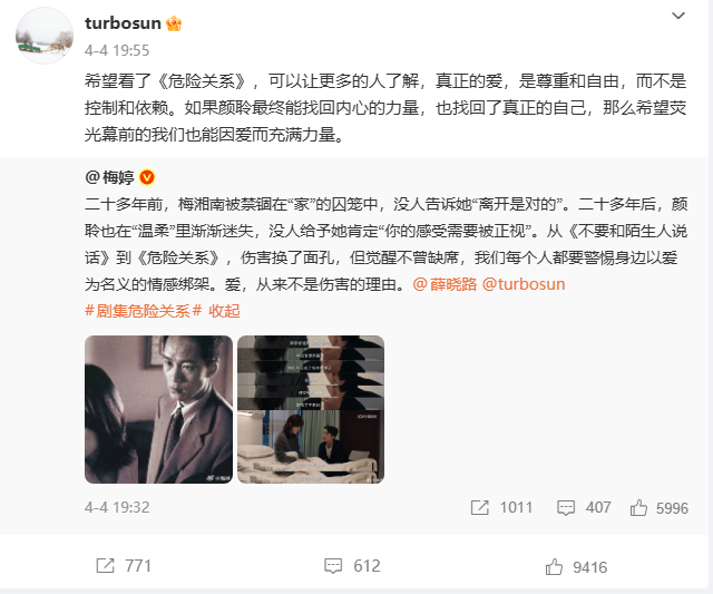 4月4日,演员梅婷在微博上写下这段话,将2001年《不要和陌生人说话》中那个被打得鼻青脸肿的梅湘南,与孙俪新剧《危险关系》中被精神操控到近乎失魂的颜聆连在一起。几小时后,孙俪隔空回应:“真正的爱,是尊重和自由,而不是控制和依赖。”这场对话迅速登上热搜,将“爱与控制”推向公共讨论中心。