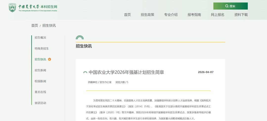 4月7日至30日,考生登录中国农业大学强基计划报名平台,按要求准确、完整地填写相关信息,完成网上报名。考生可填报一至二个专业志愿,并填报是否服从专业调剂。报名学校强基计划的考生不得兼报其他高校强基计划。