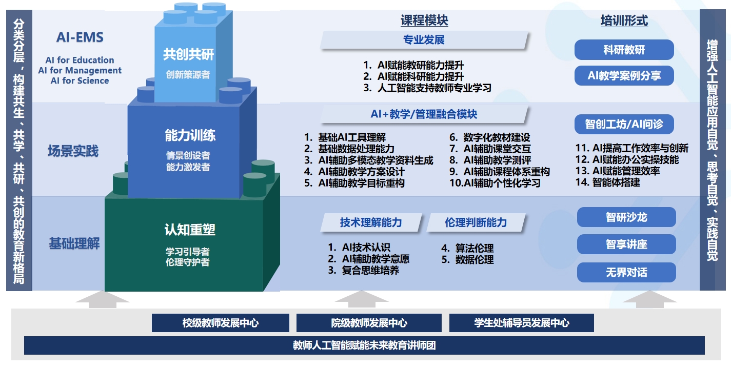 3.分层精准施训。按照“基础理解—场景实践—共研共创”的递进路径,设置四大课程模块,以“6E”培训范式对专任教师、辅导员和管理岗教师等人群精准施训。2025年累计培训41讲,参训近4000人次。