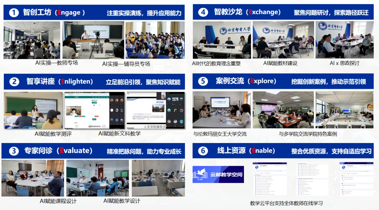 2025年6月,学校在全国高校中率先发布《教职工人工智能素养培训方案》,构建了“分层分类、全员覆盖、校院联动、场景驱动”的数字化赋能教师发展路径,形成了“技术理解—场景实践—共研共创”的三维递进培养体系,为全国高校人工智能赋能教师队伍建设提供了可复制推广的“北邮方案”。