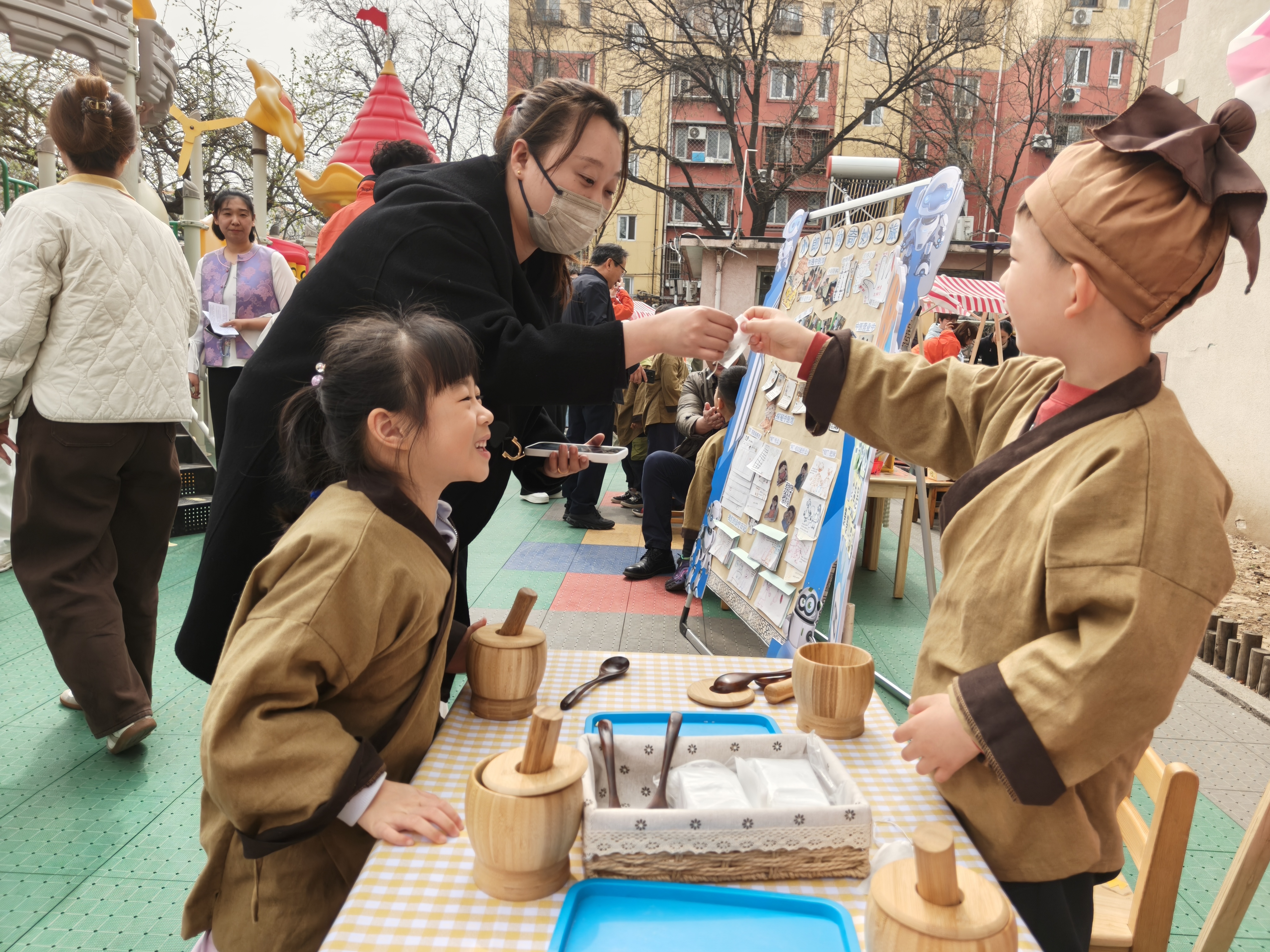 中午时分,课程集市成为最热闹的地方。丰台三幼五里店园的“蜜糖小镇角色体验游戏”里,孩子们扮演小店主、小顾客,有模有样地讨价还价;大井园的“玩转数学 快乐游戏”活动摊位前,教师用扑克牌让孩子感知数学;大成园的“赏艺品美 遇见匠心”活动展示了幼儿的扎染作品,蓝白相间的布料挂满小架。青塔二幼的“美育润心 环保同行”主题活动中,废旧纸箱变身城堡、塑料瓶成了花盆,引来参会者驻足询问。