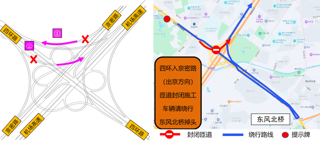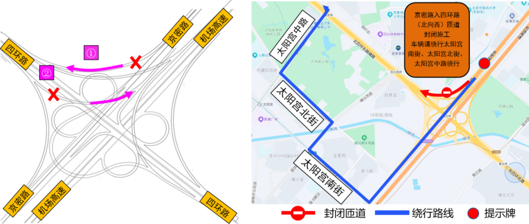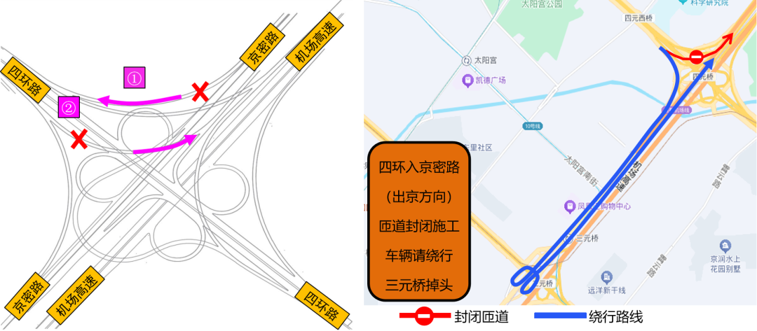 绕行措施:车辆沿京密路往南→太阳宫南街→太阳宫北街→太阳宫中路→四环路外环(4.5km)