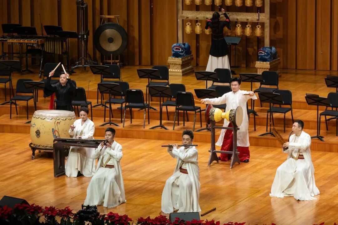中央民族乐团以《颂》开篇,先声夺人。作品借鉴“合止柷敔”的表现形式,以恢宏庄重的音响呈现出中华礼乐文明的庄雅气象,彰显出雍容自信、热情好客的大国风范。
