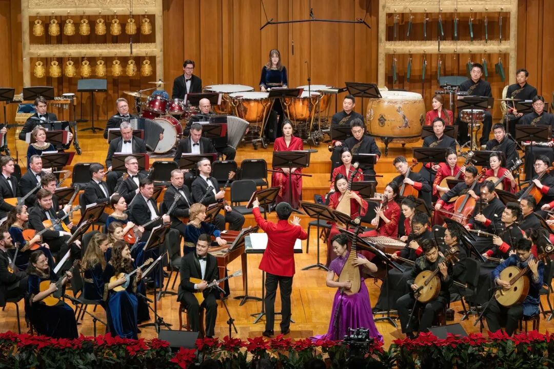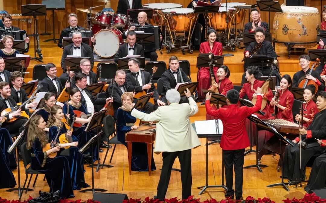 与之相映成趣的是,中央民族乐团借助《雨打芭蕉》使岭南地域的钟毓灵秀跃然眼前,以《北京故事》描摹京城晨钟暮鼓与车水马龙交织而成的城市节奏,再借《敦煌》斑斓丰沛的音响色彩与现代作曲笔法,唤醒丝绸之路所承载的历史记忆与文明想象。由此,上半场的作品呈现,已不只是民族音乐“万象”风格的展示,更如两条各具光华的文明长河,在同一时空交相辉映,折射出不同文化传统的独特神采。
