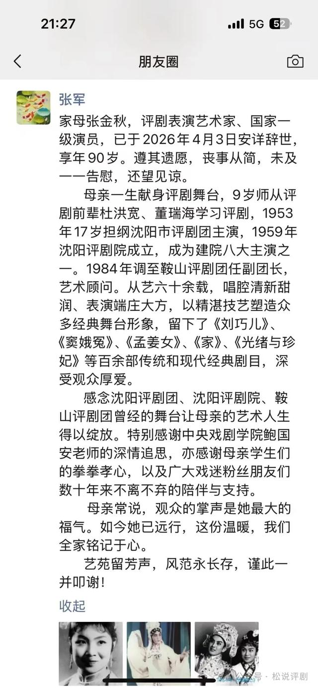 张金秋之子张军发朋友圈悼念母亲