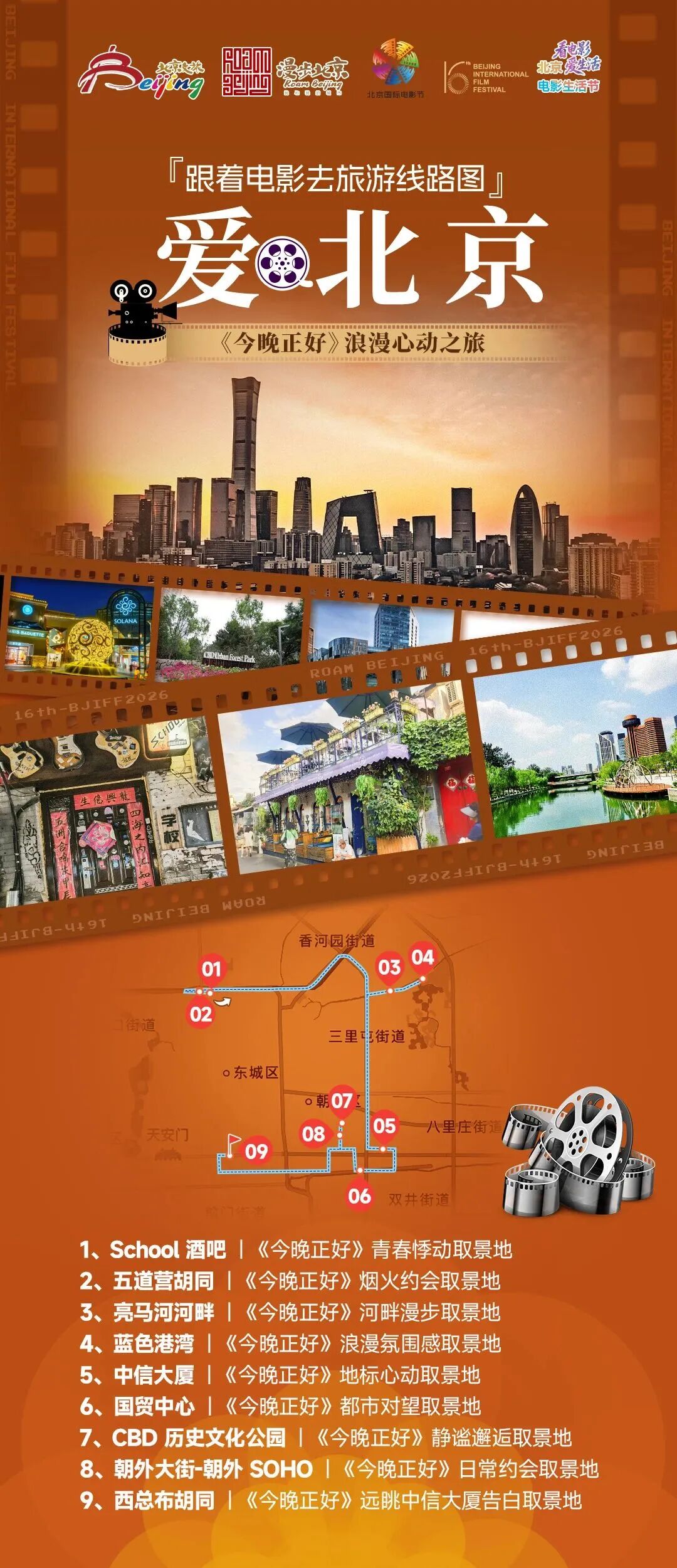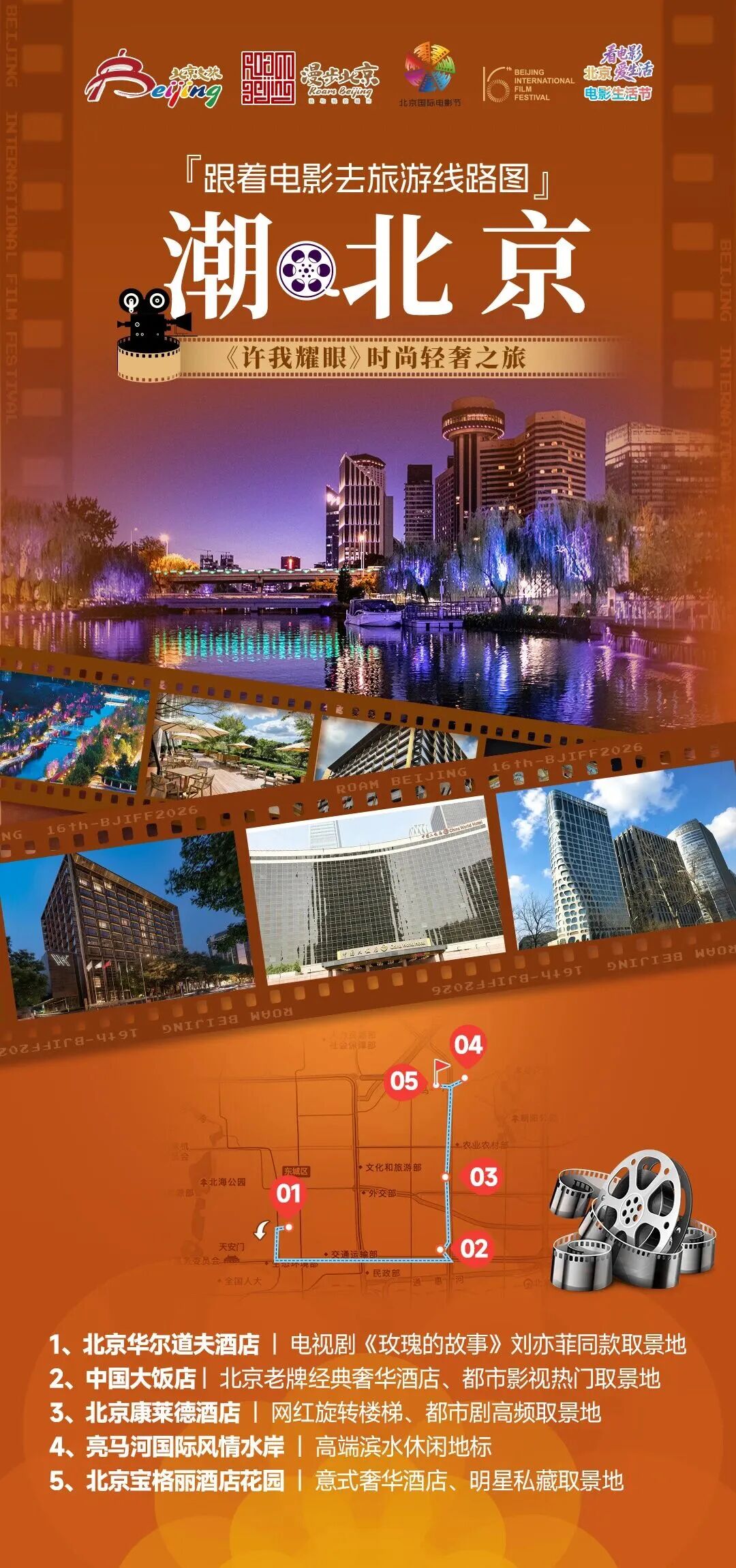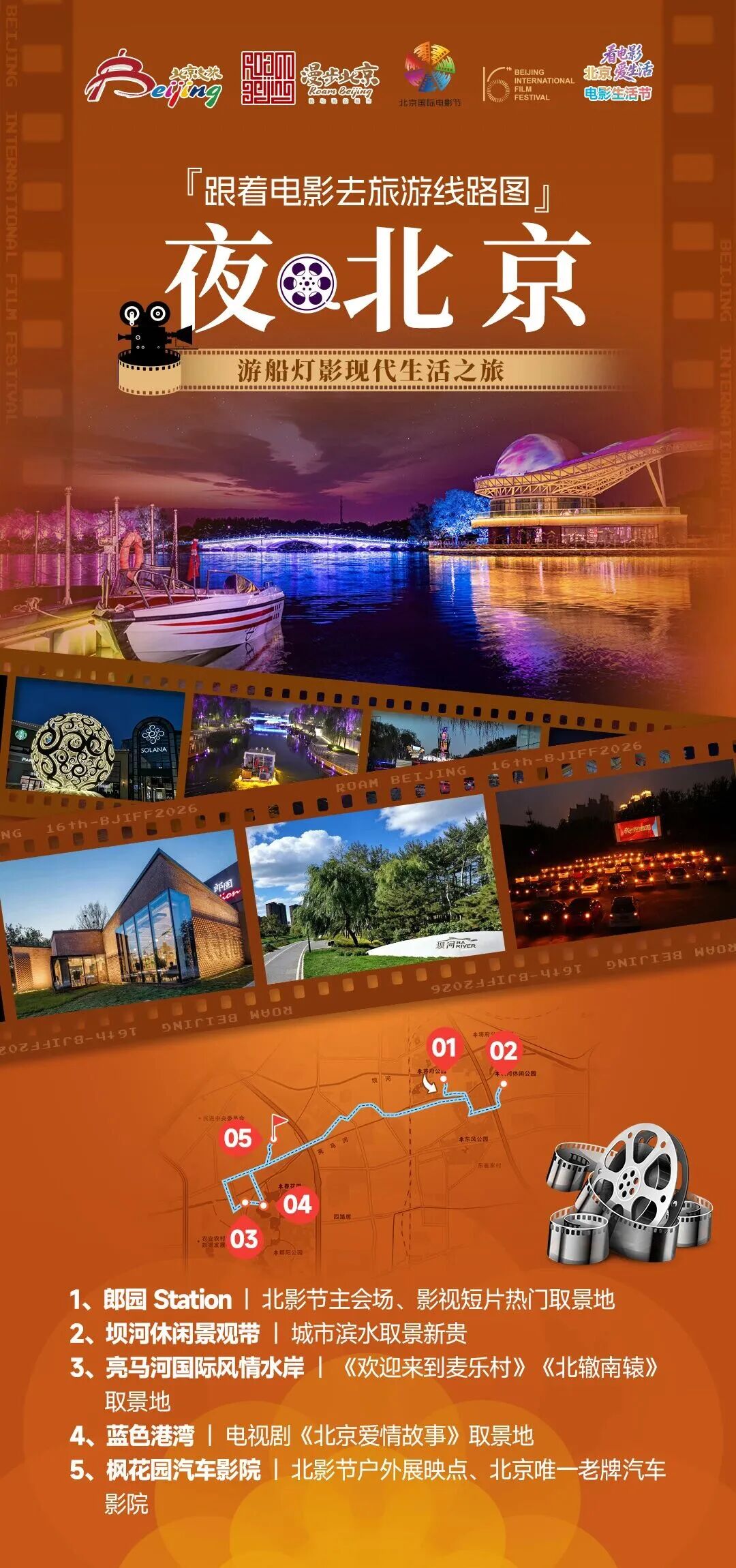 ✨ 线路解说:这条夜游线路聚焦京城东部夜景地标,串联影视同款夜色场景,打造浪漫氛围感拉满的都市夜游体验。从郎园Station的工业风光影氛围启程,沿着坝河、亮马河漫步,欣赏水岸灯火与都市夜色,打卡多部爱情影片同款取景地;再到蓝色港湾畅享童话般璀璨夜景,最终抵达枫花园汽车影院,在星光与银幕光影间,解锁京城独有的户外观影浪漫,定格夜色里的心动瞬间。