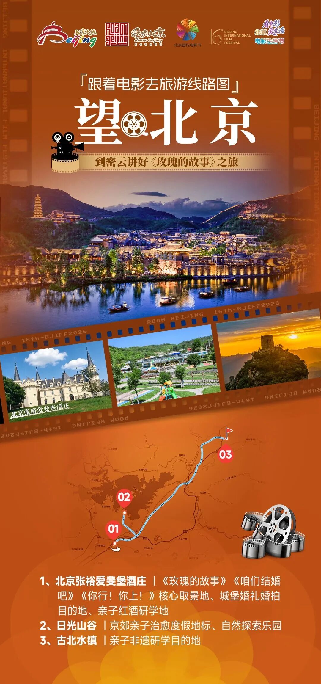 ✨ 线路解说:这条亲子向光影线路串联京郊密云的三大宝藏目的地,把影视同款打卡与亲子休闲、自然研学、非遗体验完美融合。从张裕爱斐堡的欧式城堡出发,复刻《咱们结婚吧》浪漫名场面,带孩子解锁酿酒研学乐趣;再奔赴日光山谷,在山野绿野间放松身心,玩转各类童趣设施;最终抵达古北水镇,漫步青石板街巷打卡影视同款场景,夜游赏璀璨灯火,登顶司马台长城感受史诗风光,全程兼顾氛围感、趣味性与教育意义,打造专属全家的光影度假记忆。
