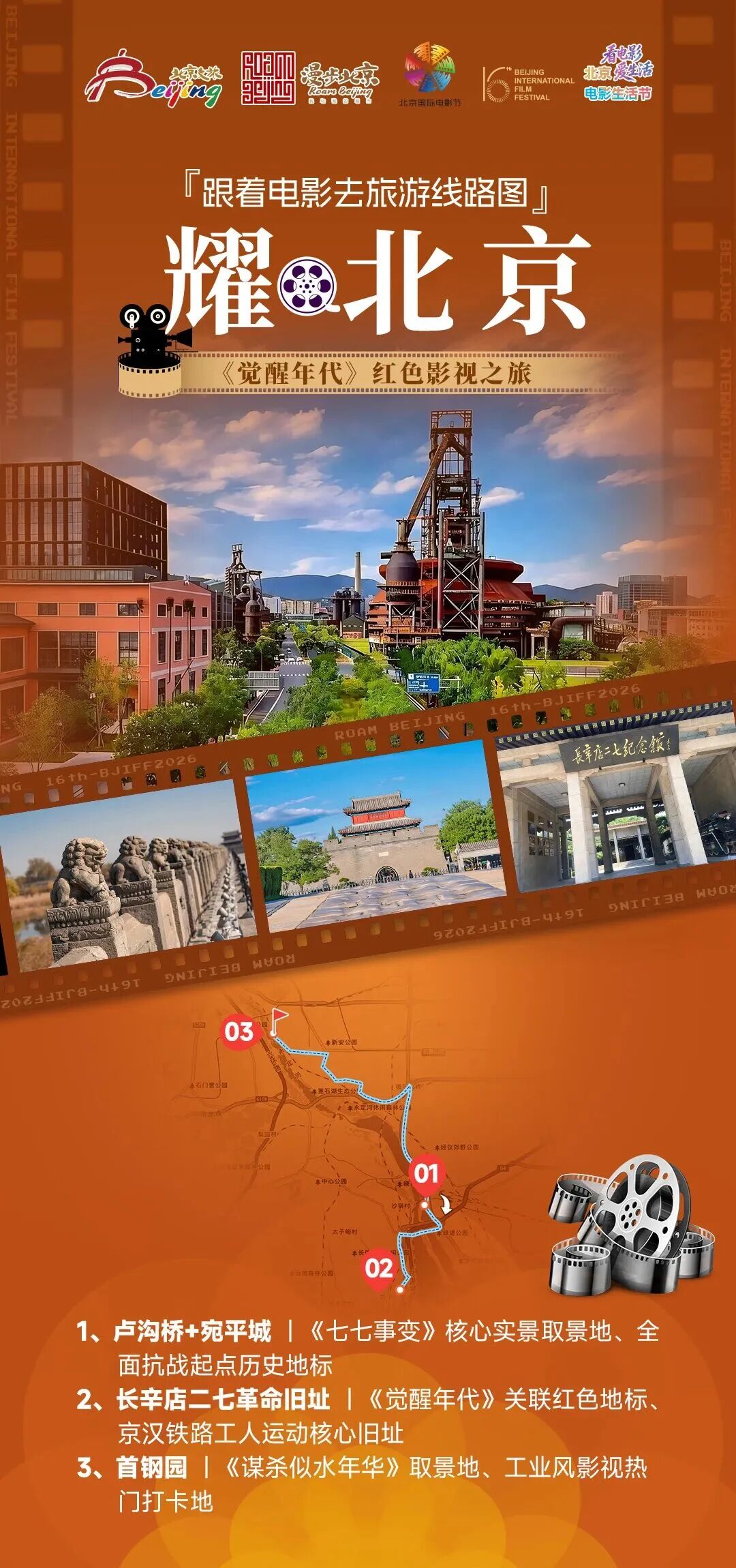 ✨ 线路解说:这条红色光影线路串联京城三大红色文旅地标,沉浸式重温家国史诗。驻足卢沟桥与宛平城,触摸《七七事变》的历史印记,感受民族抗争的铮铮铁骨和燃情烽火;探访长辛店二七革命纪念馆,追寻《觉醒年代》先辈足迹,感悟早期革命的热血信仰;漫步首钢园,在百年工业遗址中打卡《谋杀似水年华》同款场景,让青春记忆与光影记忆交织。