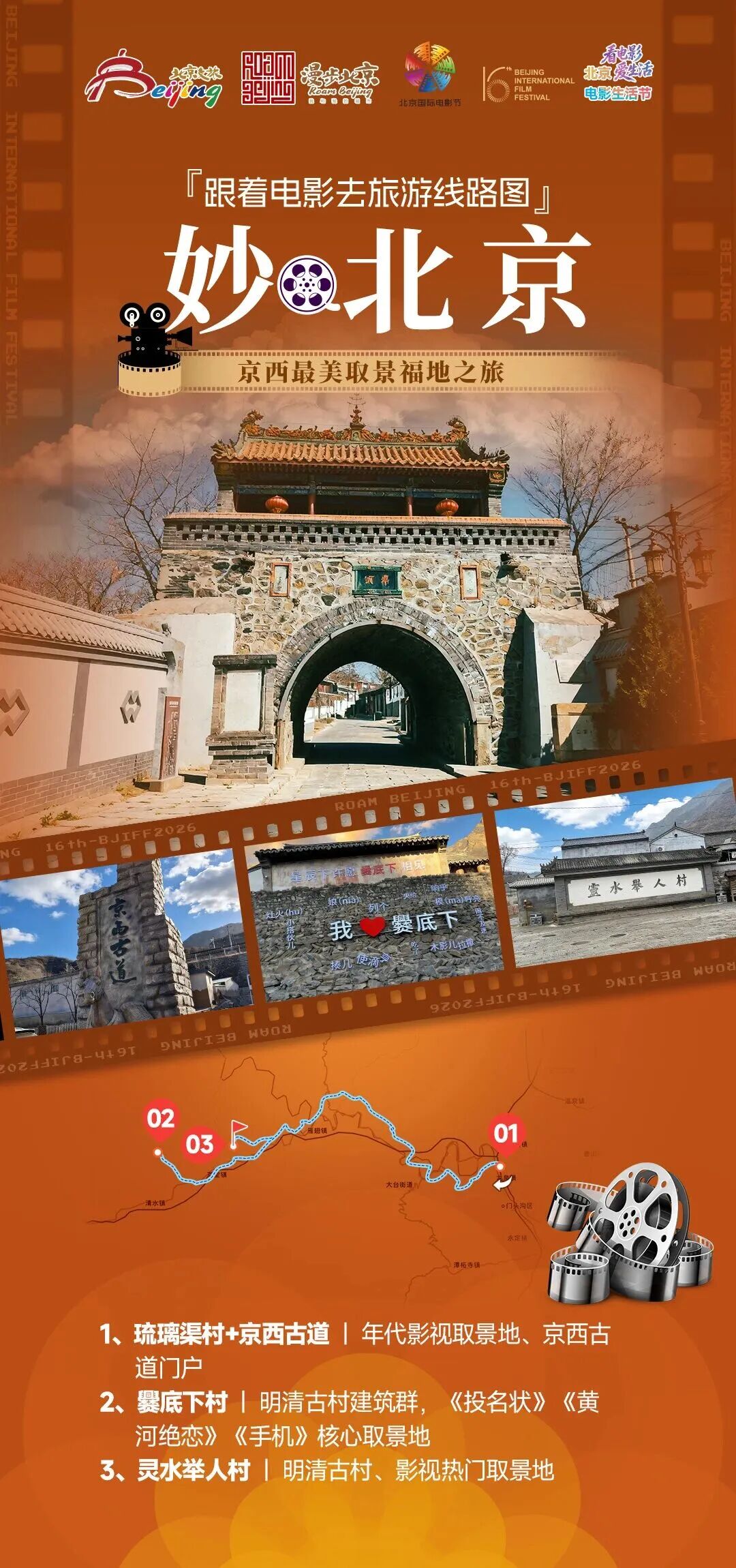✨ 线路解说:京西山水胜景是北京的一块宝地福地,也是拍摄电影的天然外景地。深入京西深山,探寻藏在山野间的影视取景福地,沉浸式感受古村人文与山野秘境的碰撞。从琉璃渠村启程,漫步沧桑京西古道,感受年代影视的氛围感;抵达爨底下村,在明清古民居中打卡多部经典影片同款场景,解锁一线天、古宅院等银幕名场面;最后探访灵水举人村,在千年文脉与静谧山野间,回味影视里的隐秘故事,尽享古村探险的乐趣。