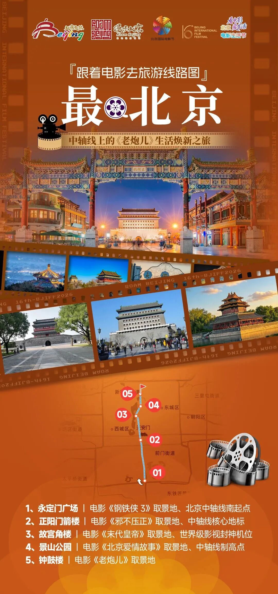 ✨ 线路解说:沿着北京中轴线漫步,一站式打卡多部中外经典影视取景地,解锁世界遗产与光影交织的独特魅力。从永定门启程,贯穿正阳门、前门大街,感受百年商街的烟火文脉;驻足故宫角楼,定格《末代皇帝》同款封神画面;登顶景山俯瞰全城,尽览中轴全貌;最后抵达钟鼓楼,回味《老炮儿》里的老北京韵味,全程串联古今风华,读懂北京中轴线的厚重与浪漫。