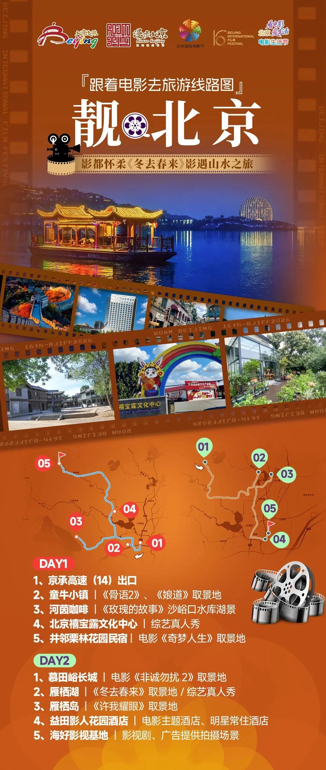 ✨ 线路解说:走进怀柔“中国影都”,一站式解锁影视探秘、山水休闲与综艺打卡。漫步童牛小镇,打卡影视拍摄实景,沉浸式感受光影魅力;前往河茵咖啡,邂逅《玫瑰的故事》沙峪口水库湖景,定格浪漫瞬间;探访北京禧宝露文化中心,打卡综艺真人秀录制现场,体验非遗;入住井邻栗林花园民宿,复刻《奇梦人生》治愈诗意旅居。次日登临慕田峪长城,寻觅《非诚勿扰 2》经典镜头,尽览雄关壮美;漫步雁栖湖周边,打卡《冬去春来》影视、综艺等取景地,畅享山水休闲;登雁栖岛,邂逅《许我耀眼》同款高端场景,饱览湖岛风光;益田影人花园酒店品尝美食,沉浸电影主题氛围,体验明星同款旅居;最后走进海好影视基地,近距离感受影视剧、广告拍摄幕后场景。从影视取景地到长城湖山,综艺、影视与休闲相融,成就一段充实惬意的光影之旅。