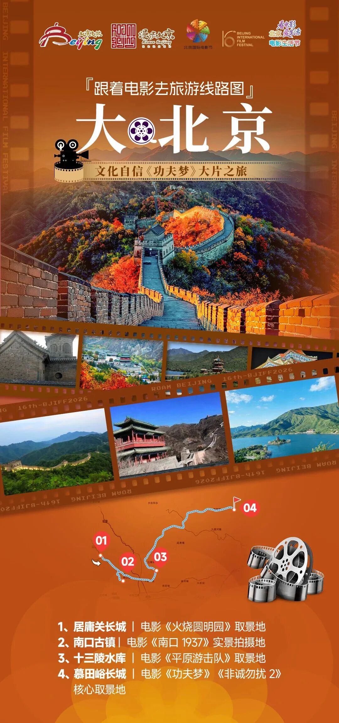 ✨ 线路解说:从居庸关长城出发,追寻《火烧圆明园》的历史印记,感受雄关承载的百年沧桑;走进南口古镇,回望《南口1937》的烽火岁月,致敬抗战先辈的热血坚守;途经十三陵水库,邂逅《平原游击队》的经典红色记忆;最终抵达慕田峪长城,在《功夫梦》的励志特训地感受成长力量,在《非诚勿扰2》的浪漫取景地邂逅温情诗意,一站式解锁大北京的影视传奇与山河盛景。