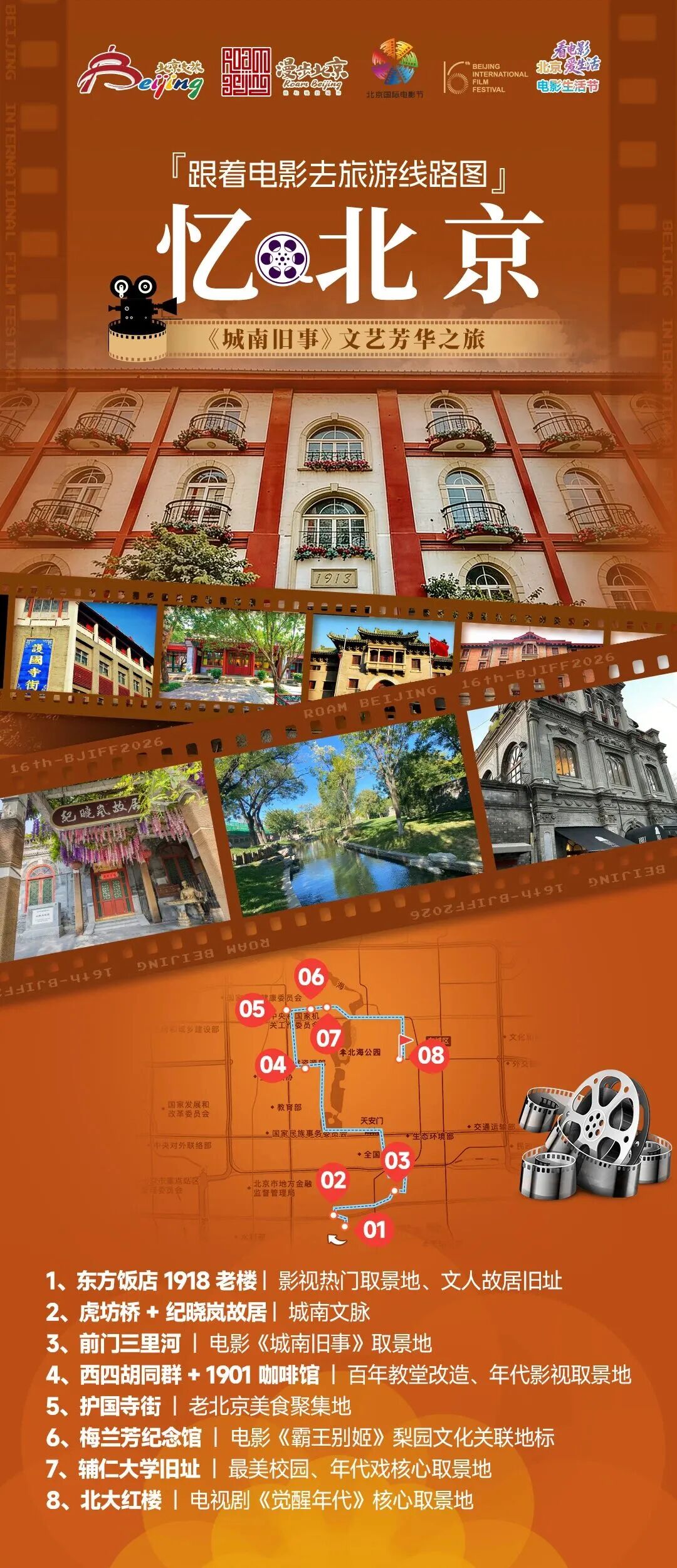 ✨ 线路解说:这条文艺线路深挖京城城南文脉与人文底蕴,串联多部经典人文影视取景地,沉浸式感受老北京的风骨与烟火。从百年东方饭店启程,探访纪晓岚故居、前门三里河,复刻《城南旧事》旧时光;漫步西四胡同、打卡复古咖啡馆,品味文艺慢生活;途经护国寺街补足烟火滋味,再探访梅兰芳纪念馆、辅仁大学旧址,感受梨园文化与书香气息;最终抵达北大红楼,追寻先辈足迹,让人文情怀与光影记忆深度交融。