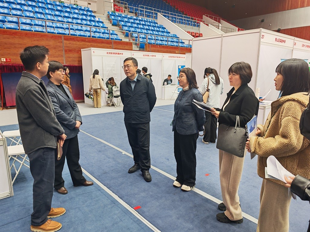 双选会现场,首都师范大学附属育新学校房山分校、北京理工大学附属实验学校、北京市前门外国语学校、北京市杂技学校、陕西学前师范学院、山东省广饶县第一中学等96家学校,提供有效需求岗位2500余个,部分中学书记、校长亲自到现场选拔人才。学校党委常委、副校长郑文涛到现场检查指导,房山区人保局大中专就业办公室胡伟介绍了就业服务政策、职业能力培训课程,教委人事科刘思尧介绍了2026年教育系统第一批的招聘情况,郑文涛还与用人单位亲切交流,详细询问接收简历的情况、招聘岗位的设置以及招聘标准。