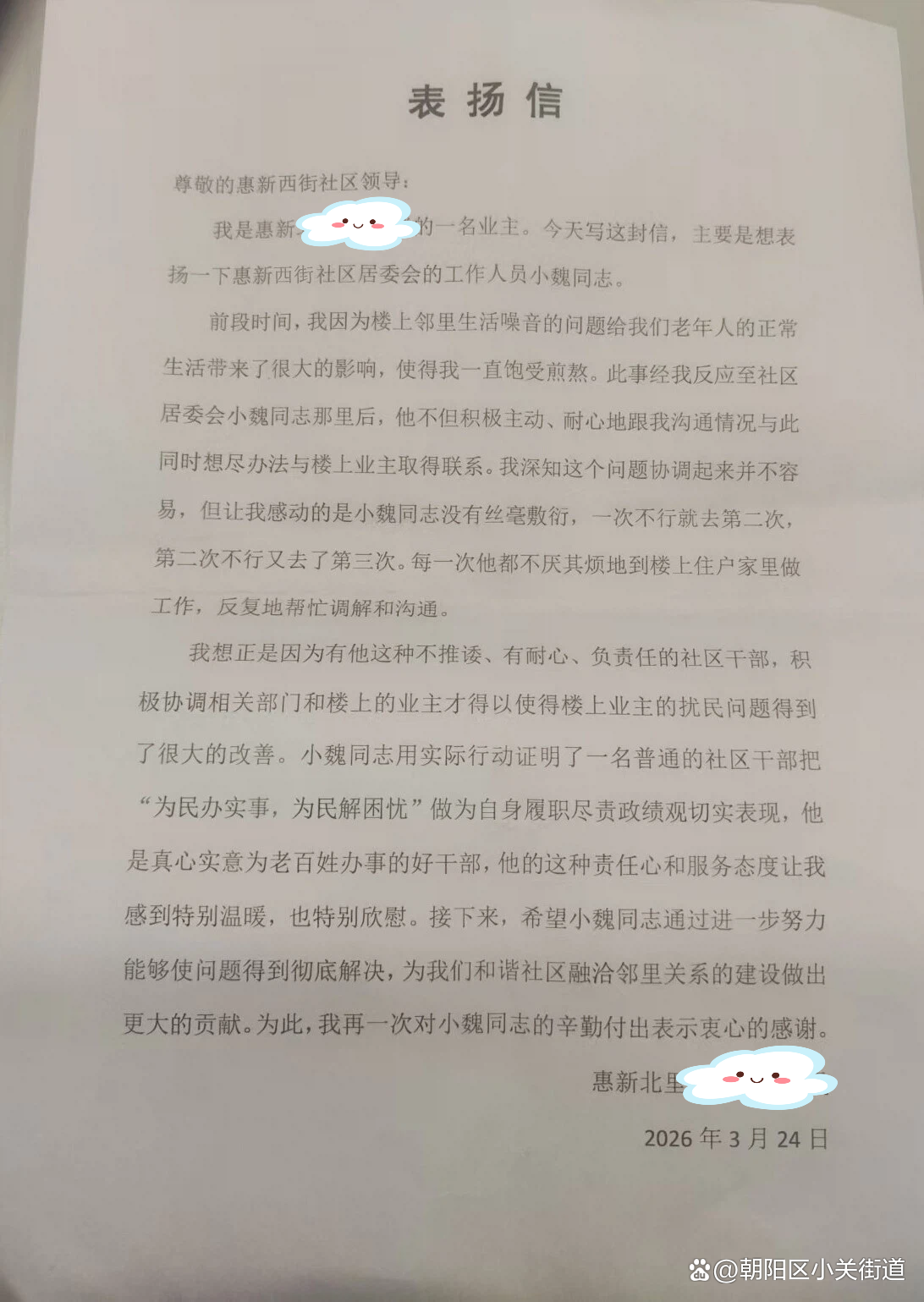 一纸表扬信,浓浓为民情。近日,惠新西街社区收到辖区居民张女士表扬信,为社区工作人员耐心调解邻里噪音纠纷点赞。