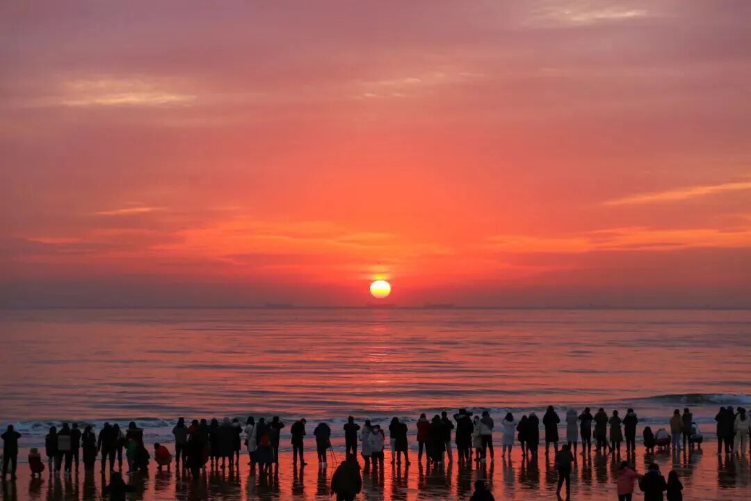 破晓晨光跃出海面,金橙漫卷,染亮云天;万顷碧波浮光跃金,朝晖铺海暖意初生;朝晖洒落海岸,点亮温暖耀眼的城。一轮朝旭迎春,让第一缕晨光照亮整座山海之城。