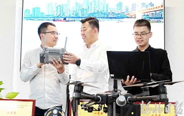 4月3日,雄安新区中关村科技园,雄安佰筑信息科技有限公司创始人张怀战(中)与技术人员一起探讨项目中的无人机巡检路线方案。河北日报记者 刘光昱摄