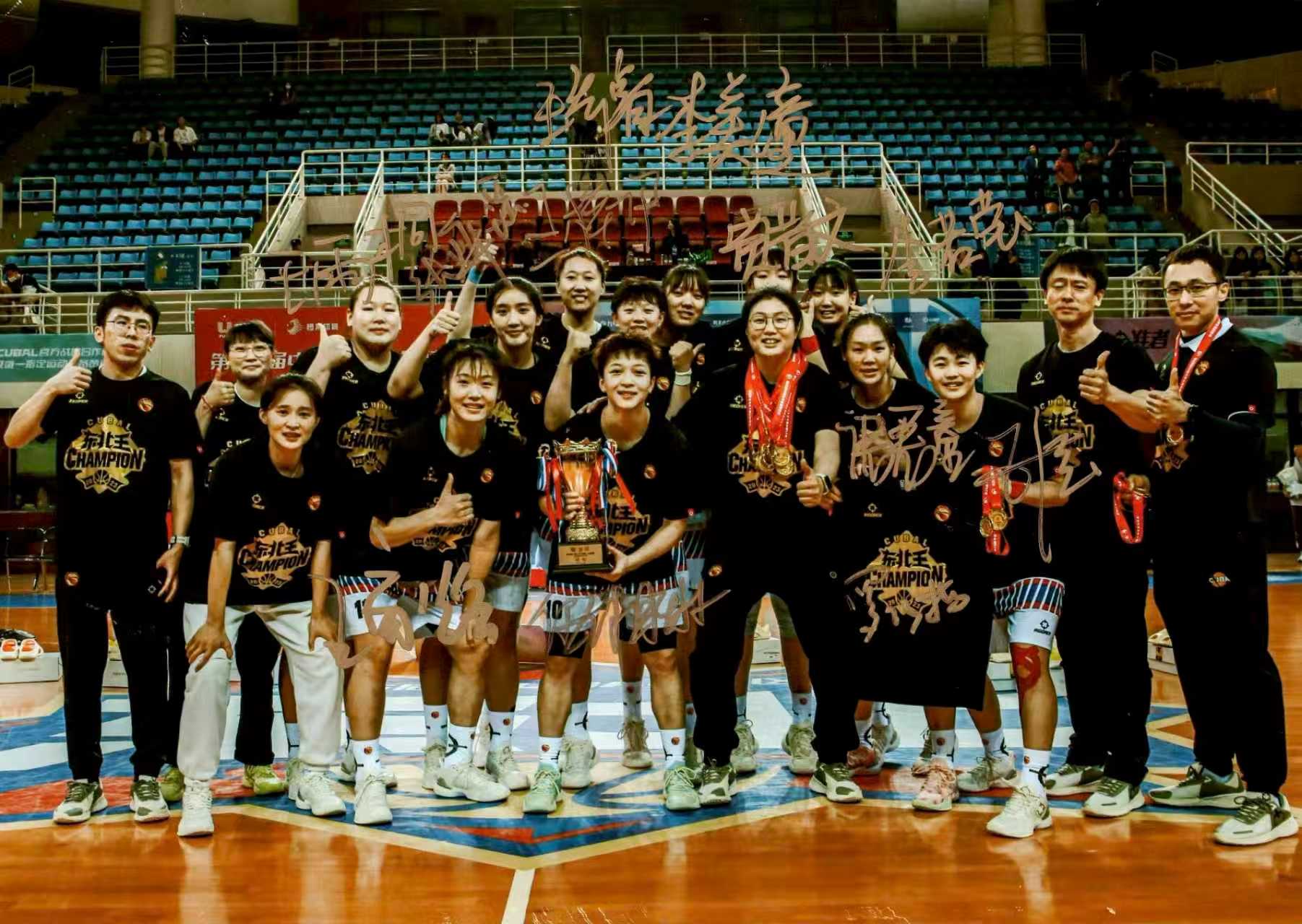 2023年北大女篮力克清华女篮夺得CUBAL东北赛区冠军后的合影,此后三位外线队员先后受伤
