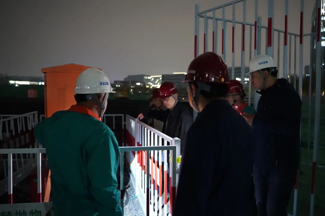 夜幕下,检查组沿着施工通道实地查看基坑周边防护、止水帷幕施工、土方开挖外运等关键环节,详细检查现场安全管理、消防设施配备、临时用电规范、夜间照明与警示标识设置等情况,并对作业面进行“地毯式”排查。在基坑边缘,检查人员详细询问支护桩施工进度及监测数据,查看临边防护是否到位、警示标识是否清晰,同时逐一核验109名在场人员的作业状态及特种作业人员持证上岗情况,确保夜间施工人员配置合规、精神状态饱满。