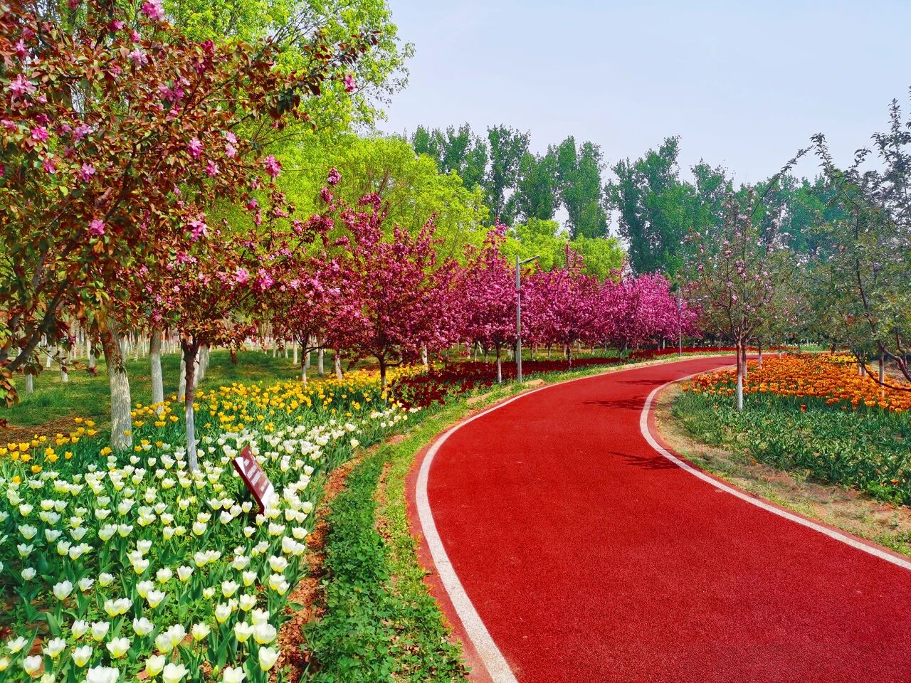从火红郁金香花海旁穿过,你的目光一定会被那条红色的健身步道吸引。它像一条燃烧的缎带,蜿蜒在绿色港湾的林水之间。郁金香的红是热情,步道的红是活力——两者交织,让人忍不住想跑起来、跳起来。在这片火红中迈开脚步,春天就有了心跳的节奏。