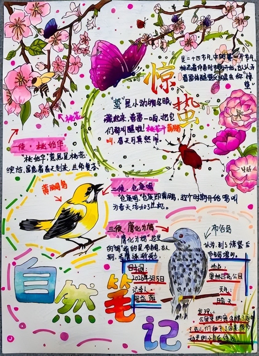 放学后我跑去河边。柳条上冒出小芽苞,像绿色小米粒。蚂蚁在树根边爬来爬去——它们是被春雷叫醒的吧?几只麻雀在枝头跳来跳去,叽叽喳喳。原来节气是大自然的闹钟,一到时间万物都醒了。