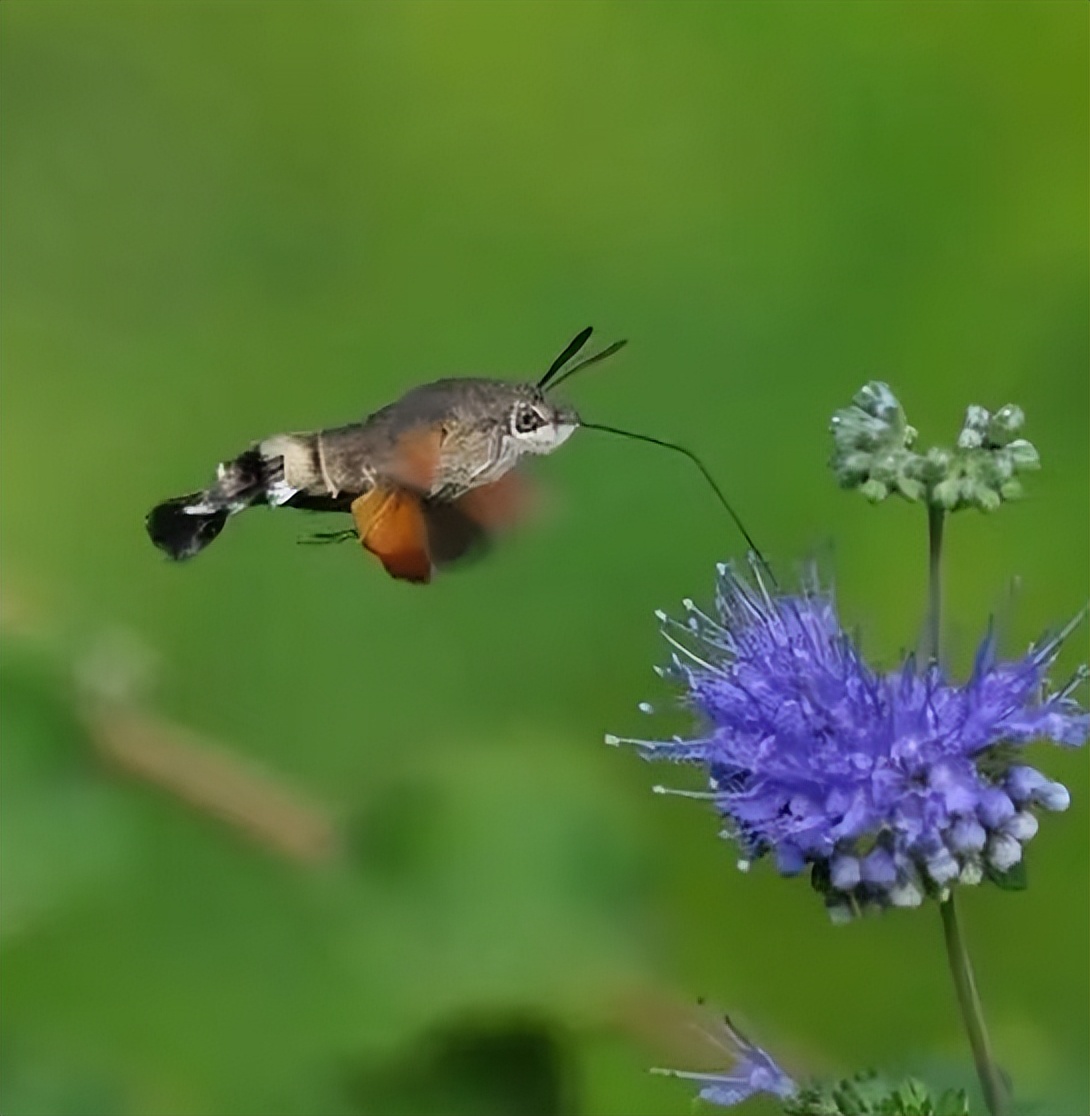 一个迅疾的灰影,闪电般掠过蜡梅,伸出修长的喙管吸食花蜜。那是小豆长喙天蛾(Macroglossumstellatarum),这种大型天蛾常被误认为蜂鸟,不同于其他夜行性蛾类,经常在阳光充足的白天飞舞在花丛之间。