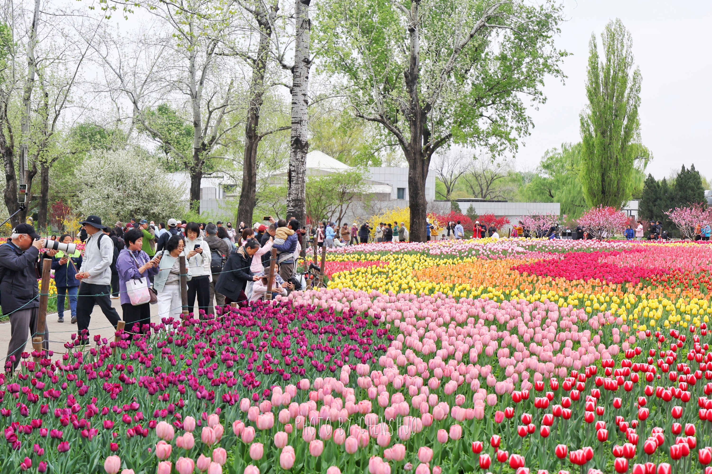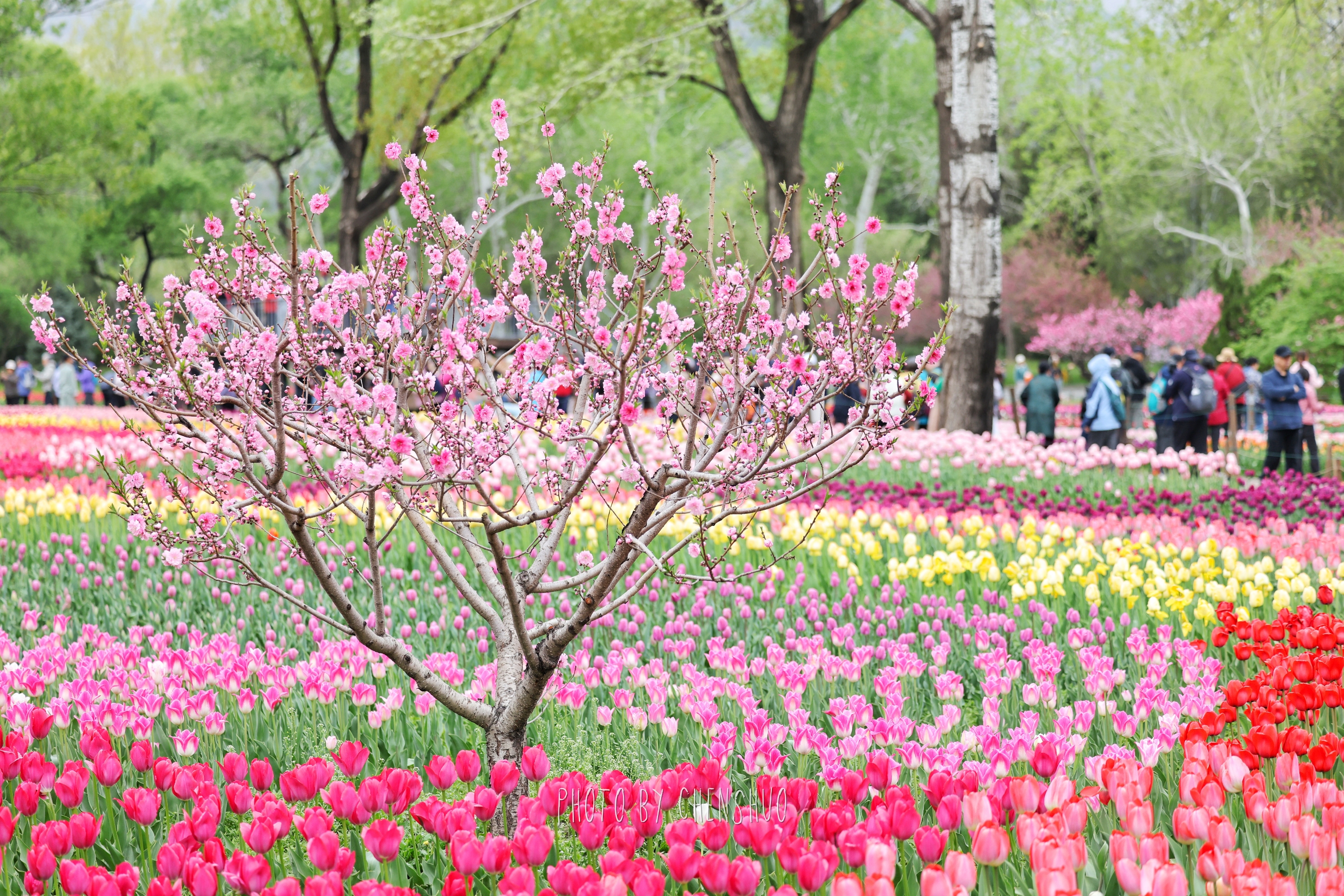 漫步在这片无边花海中,各色郁金香亭亭玉立,迎风轻舞,如同大自然编织的绚丽锦缎,铺满整个园区。低头可赏郁金香娇俏绽放,抬头可见碧桃花枝摇曳,远眺更是山色清朗、春意盎然。一步一景,满眼皆是繁花,处处充满诗情画意,不用远赴他乡,在国家植物园就能独享这份独属于京城的春日美好。