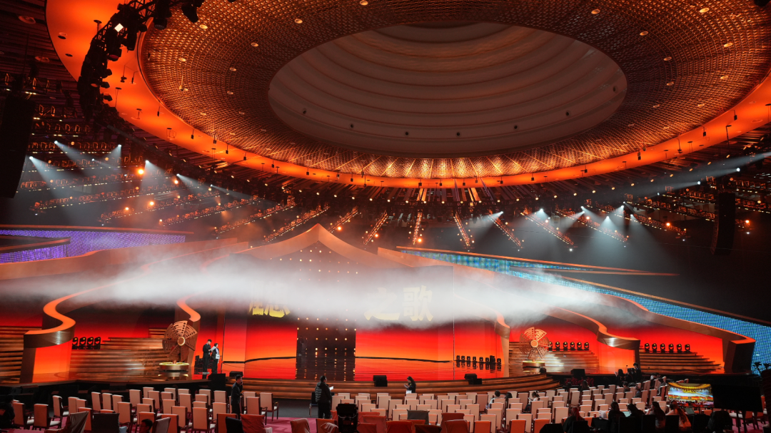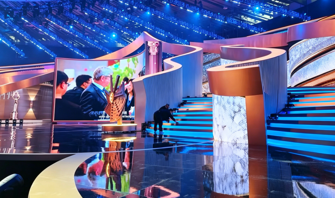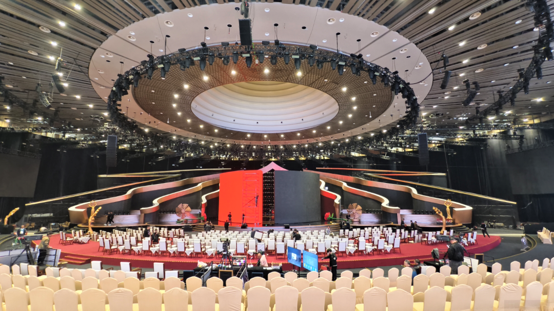 走进开幕式场地,工人们正在紧锣密鼓地进行设备调试等收尾工作。舞台主体形象为亮金色框架结构,安装可移动开合屏幕,多层次270度观众席将设置1800个座位。