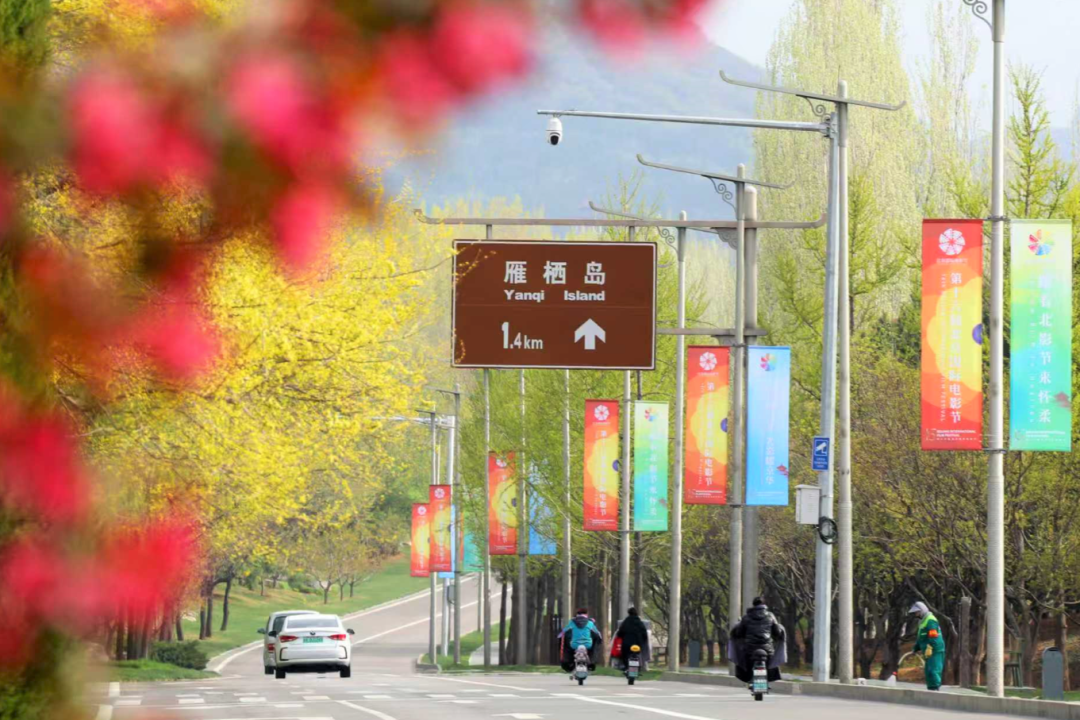 此外,在京承高速14出口处,“‘天坛映百花·光影耀京华’跟着北影节来怀柔”字样横幅向广大市民游客发出邀请。在京承高速14出口至雁栖岛、雁栖湖南环路的道路两侧,1000余面北影节道旗随风舞动,让光影氛围一路延伸,为这场影视盛宴注入满满活力。