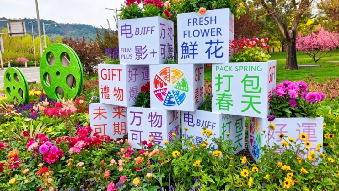在雁栖湖国际会展中心西门对面,一组主题为“光影筑梦・花映雁栖”大型立体花坛惊艳亮相。以“小金人”为视觉核心,搭配花艺瀑布、彩虹线条等,深化北影节专属氛围。北侧红绿灯四角及隔离带中心岛地栽花卉约850平方米,并在各区域设置胶卷、摄影机、山形铁艺等不同主题造型小品,搭配绚丽花带,用繁花喜迎全球电影人到来。
