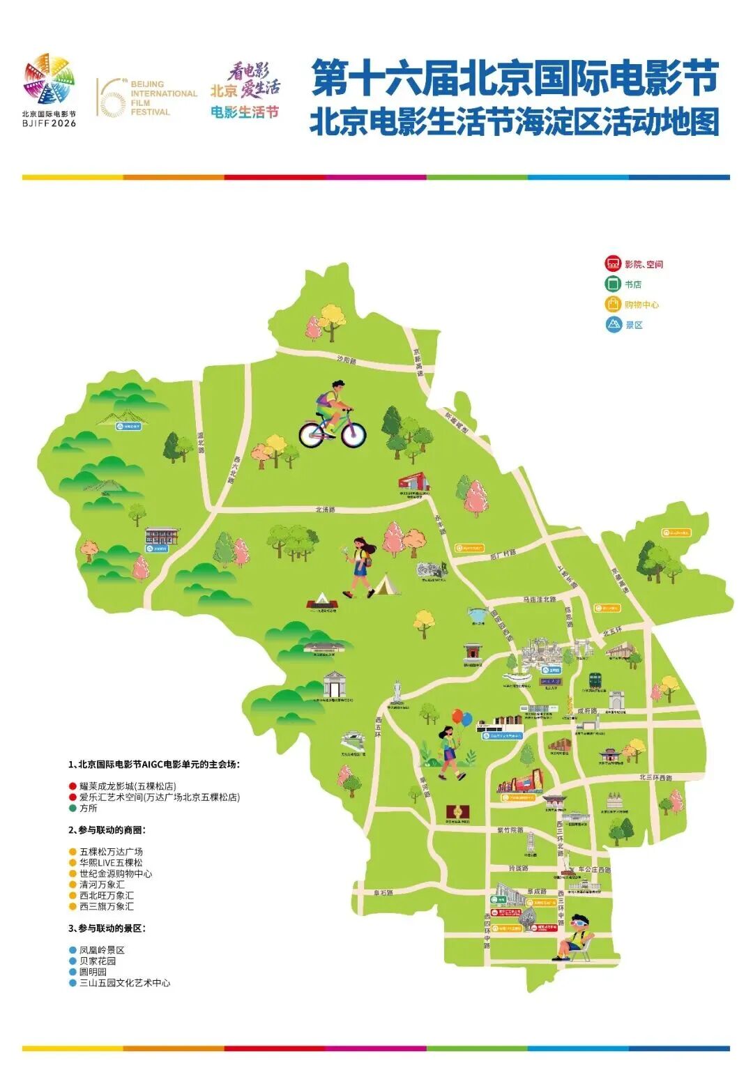 今年首次推出分会场的概念,除了在怀柔、朝阳2个区设置主会场之外,还在东城、西城、海淀、丰台、石景山、通州、大兴7个区设置电影节分会场。9个区立足自身特色,精心打造丰富多样的配套活动,并推出专属活动地图。截至目前,覆盖全市17个区的50余个商圈、90余个商场、1500余家商户参与今年的北京电影生活节,共同营造电影活动全城开花、处处皆有电影节的良好氛围。