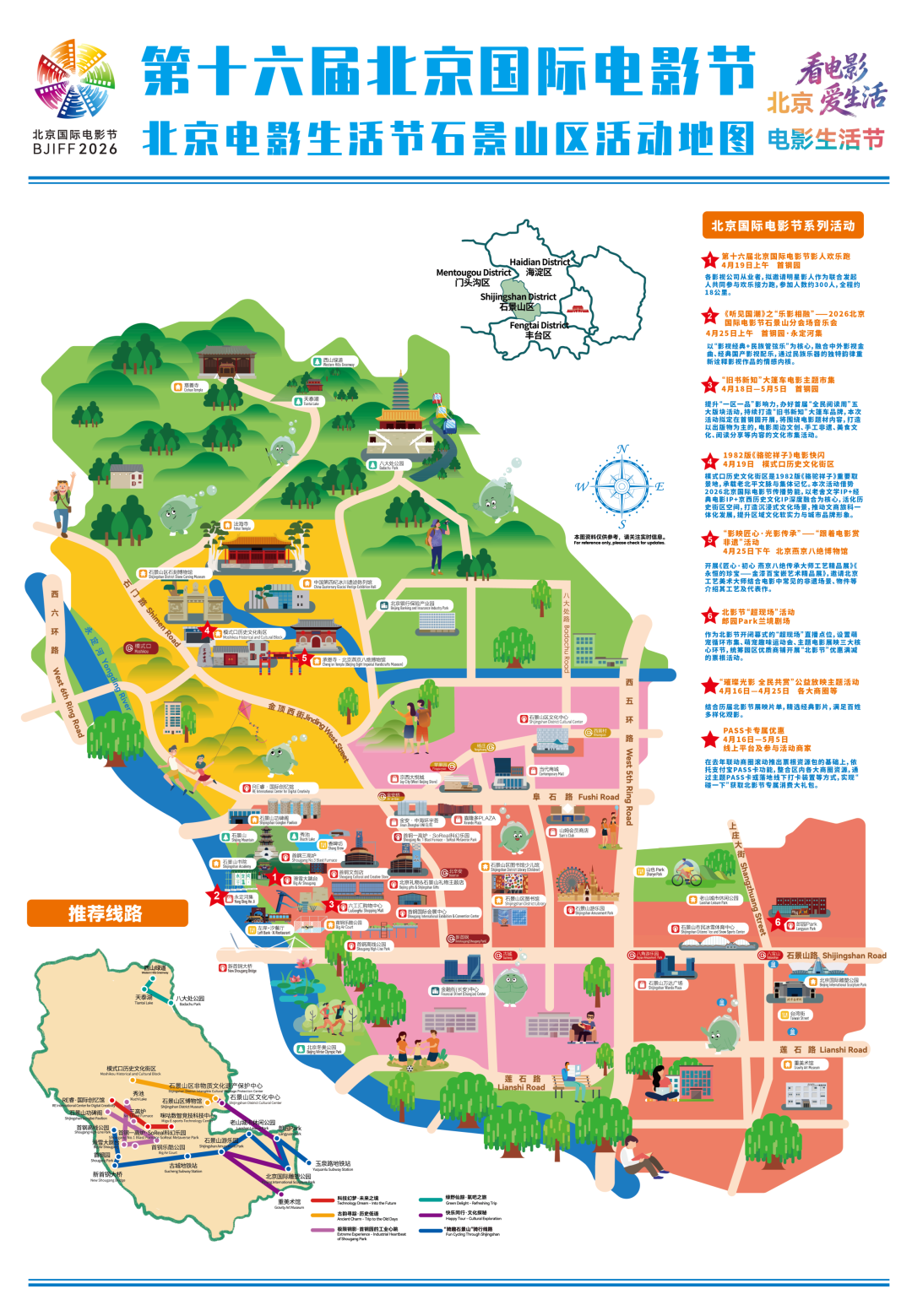 石景山策划八大主题活动,包含影人欢乐跑、电影主题市集、电影音乐会、非遗体验、公益放映等,让电影艺术融入日常。推出电影节专属PASS卡与消费地图,联动商圈、景区、餐饮等多种业态,打造全域光影消费体验。