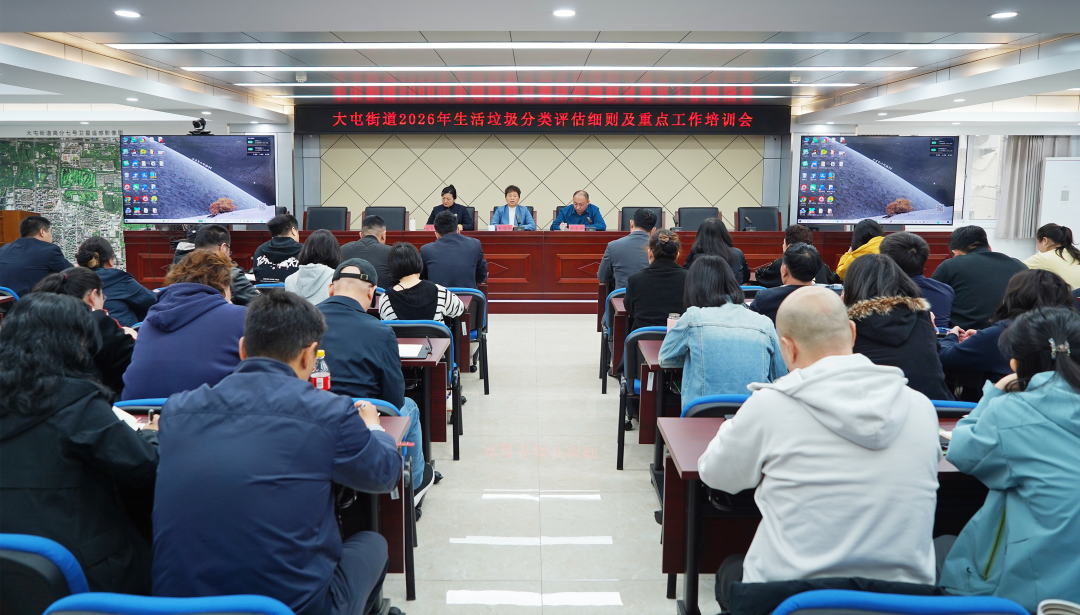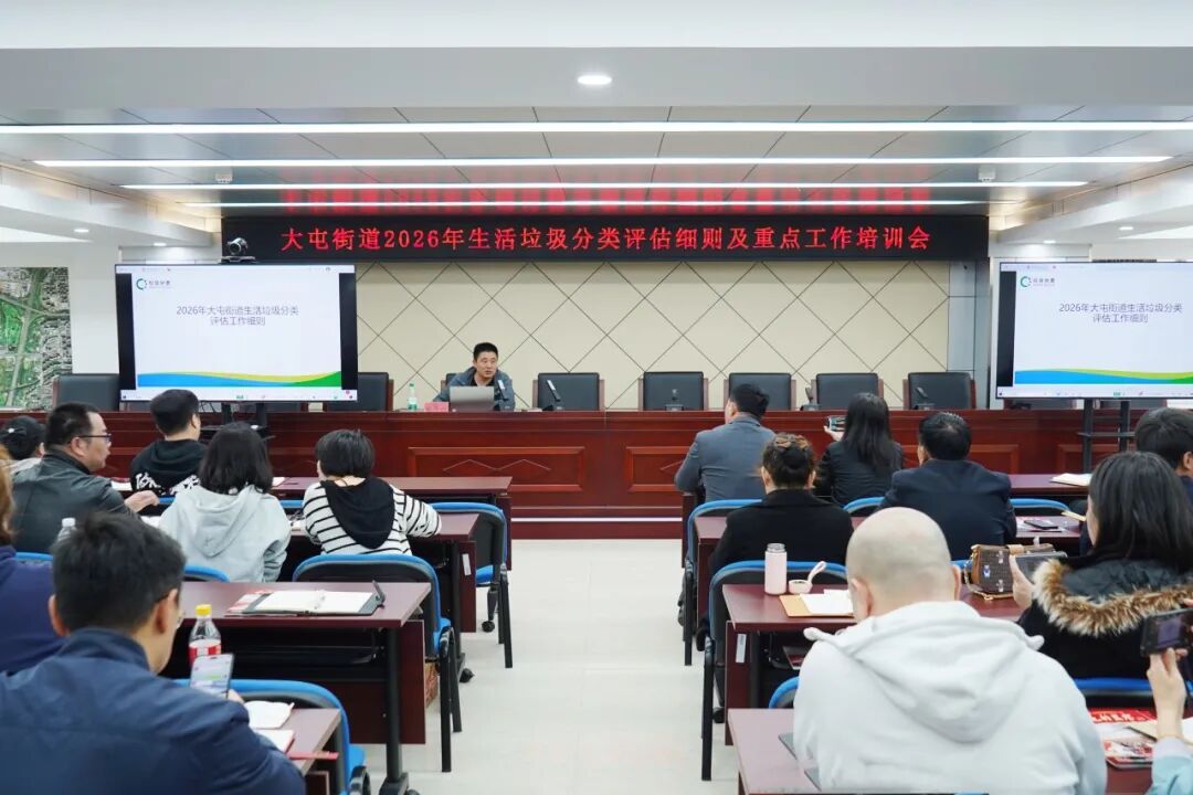 为深入贯彻落实市、区生活垃圾分类工作部署,精准对标新版评估指标体系,压紧压实社区、物业及三方单位主体责任,全面提升辖区垃圾分类治理水平,4月14日,大屯街道召开2026年生活垃圾分类评估细则及重点工作培训会。街道办事处主任王海玲、副主任武文一出席会议,各社区相关负责人及辖区物业负责人参会。