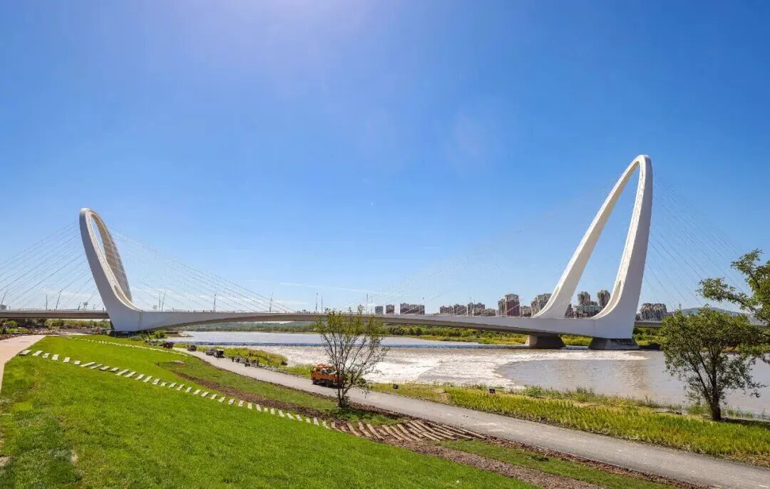 大桥横跨永定河,桥身白色,在蓝天下很显眼。从桥下穿过去,河面突然开阔。对岸柳树成行,远处西山横亘。