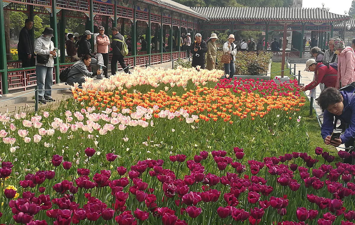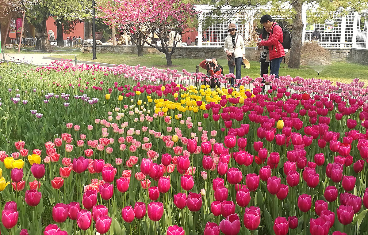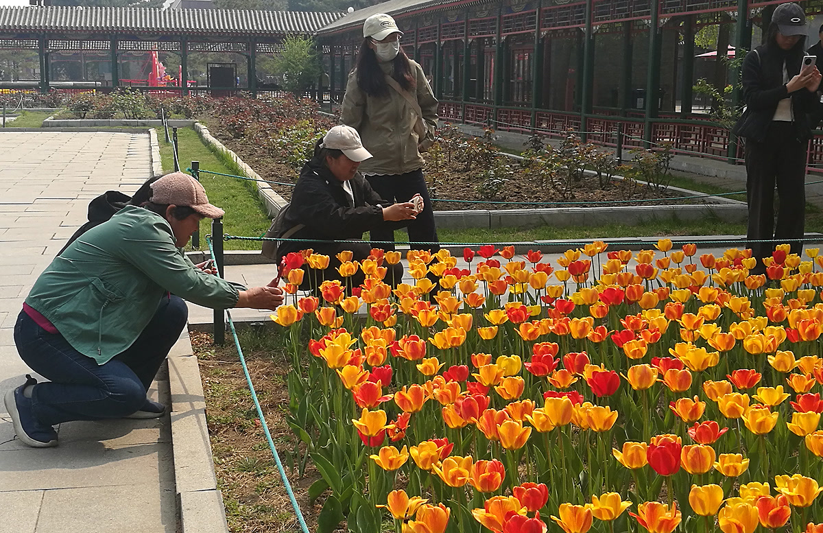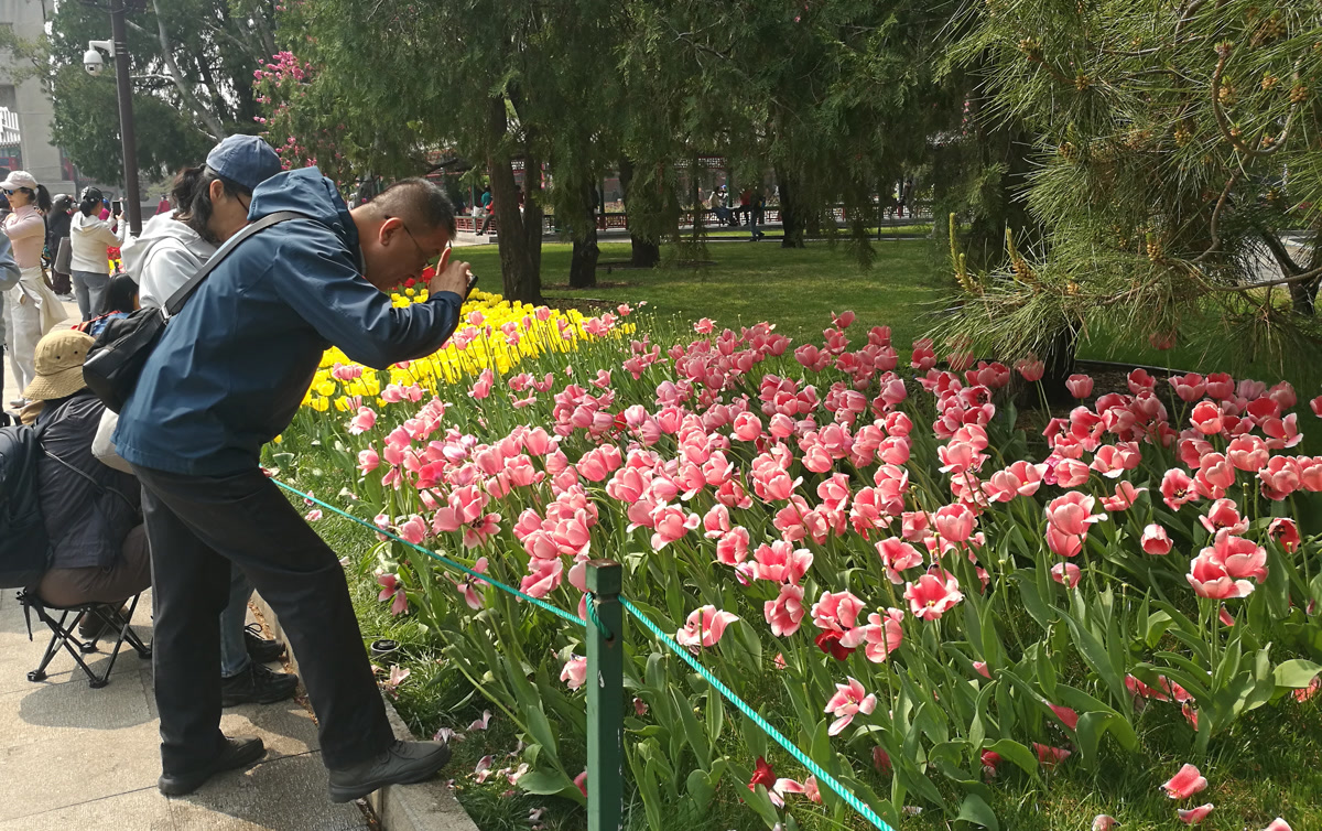 “每年这个时候我都会来中山公园拍郁金香,这里的品种多、颜色全,搭配古柏和红墙,特别有味道。”一位手持专业相机的摄影爱好者告诉笔者。正如他所说,中山公园的郁金香展最大的特色,在于花海与古建的完美融合——千年辽柏、社稷坛红墙、五色土等历史景观,成为郁金香最独特的背景。