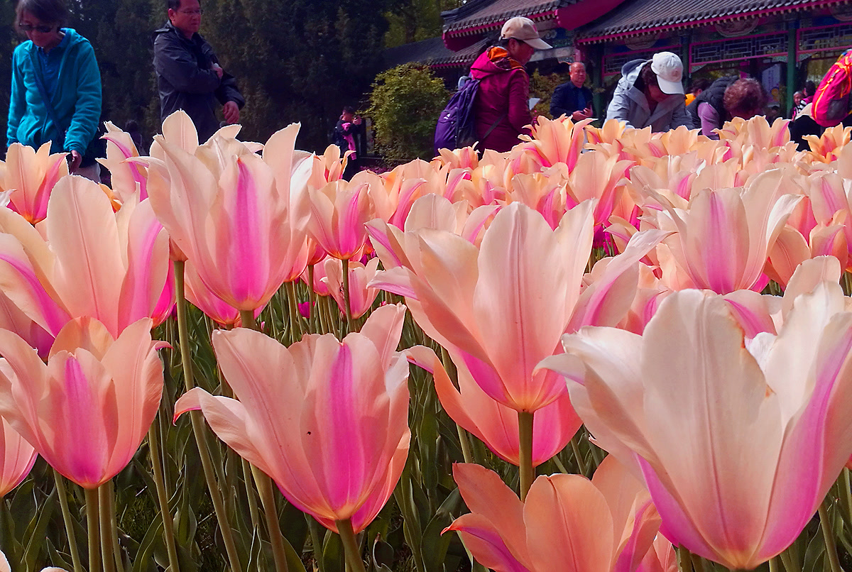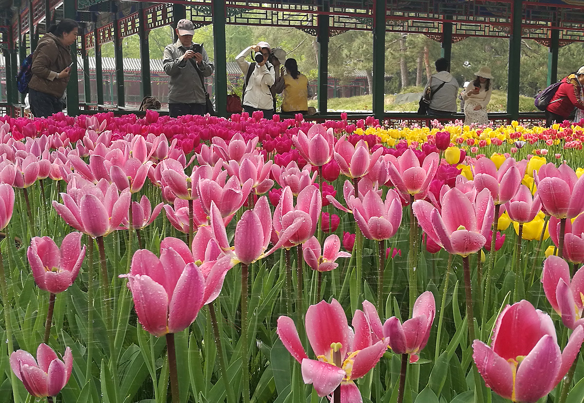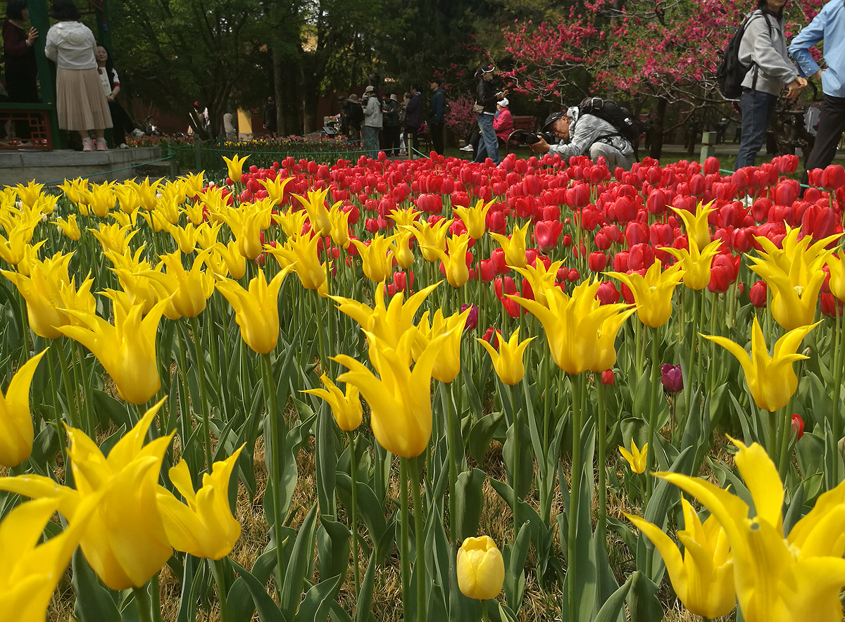 “每年这个时候我都会来中山公园拍郁金香,这里的品种多、颜色全,搭配古柏和红墙,特别有味道。”一位手持专业相机的摄影爱好者告诉笔者。正如他所说,中山公园的郁金香展最大的特色,在于花海与古建的完美融合——千年辽柏、社稷坛红墙、五色土等历史景观,成为郁金香最独特的背景。