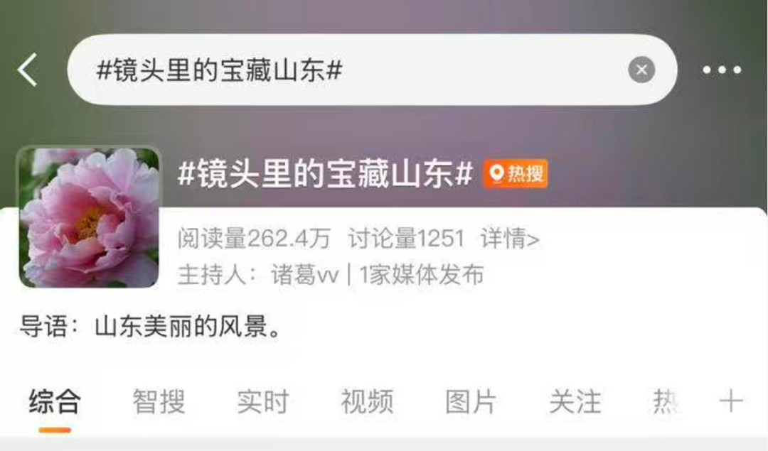 人民网、光明日报、中国旅游报、大众日报、山东电视台、新黄河等媒体对活动进行宣发报道,累计发布稿件80余篇;自媒体平台发布话题笔记、游记、微博、短视频等内容120余条,#镜头里的宝藏山东#话题登上微博热搜榜,有效提升“宝藏山东”的认知度,以镜头为媒,为文旅高质量发展赋能。