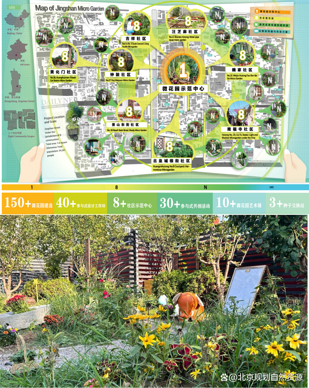 依托“三师协同”模式,清华同衡团队规划师和建筑师从街区整体生态格局出发,系统完成绿色空间体系规划,明确了小微空间的布局结构与功能定位,为后续的微景花园营造提供了坚实的规划依据与空间指引。在此基础上,中央美院团队园艺师以“艺术赋能社区”为核心策略,深入开展全街道小微空间摸查,建立空间资源台账,并绘制《景山街道微景花园打卡地图》,为街区更新提供了可视化的空间基础数据支撑。通过参与式营造,联动居民、社区与社会组织,进行方案共创与动手实践,以“针灸式”渐进更新为策略,将街头巷尾的闲置角落与低效空间,转化为兼具生态功能与人文关怀的微景花园。这一实践将各方合力真正落脚于居民,使“花园”有共享之意、“家园”有共治之实。