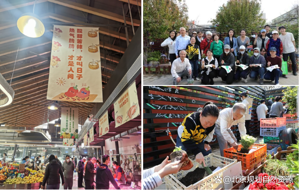 兆军盛菜市场是景山街道的重要民生设施,改造前建筑风貌较差、设施陈旧、环境杂乱。清华同衡团队立足古都风貌保护与民生需求,对菜市场进行了改造提升。规划师和建筑师们从“十五分钟生活圈”出发,精准定位菜市场在街区公共服务体系中的功能,通过恢复建筑传统风貌,使其重新融入老城肌理;通过业态定向引入,打造品类齐全的一站式“邻里服务大厅”。中央美院团队园艺师针对改造后废旧菜筐处置难题,在美后肆时微花园示范中心联动景山街道杏林中草药文化,组织居民利用废旧菜筐开展中草药种植和墙体艺术共绘活动,延续生活烟火与文化气息。