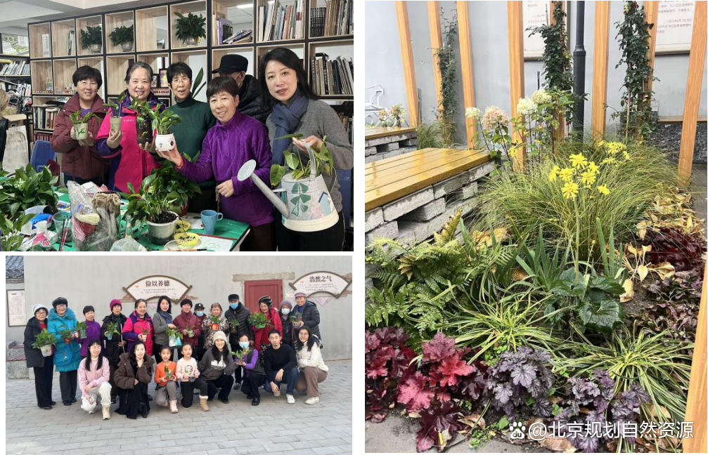 2025年,为进一步推进花园城市建设,在区园林绿化局的统筹下,东城区建立园艺师制度,中央美院侯晓蕾教授被聘为区总园艺师。景山东街社区提供居委会一层空间,设立东城区总园艺师工作站。中央美院团队充分发挥总园艺师的专业引领作用,在居委会院内打造微花园示范点,定期发起社区美育与艺术共创活动,组织居民参与花园营造、植物养护、花艺培训等,让社区治理与公共美学深度融合,充分体现了“人人是园丁”的共建共享理念。如今的沙滩后街35号院,花池生机盎然,居民围坐聊天的休闲角成为具有人情味的“共享客厅”。