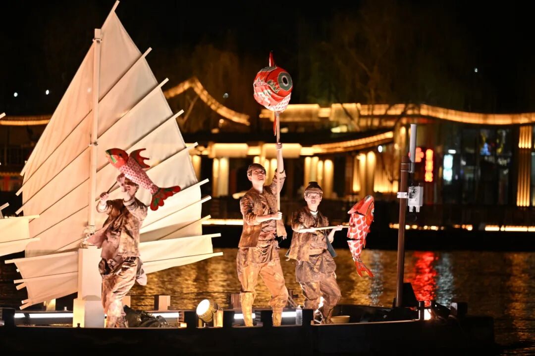 表演开篇,水幕投影勾勒出白浮泉源的清澈水流,元代工匠们凿石引水、筑坝设闸的身影在光影中浮现,再现郭守敬开通通惠河的水利壮举。没有宏大的场面堆砌,只有对历史的真实还原,82公里河道、21座闸坝、引西山诸水、通大都粮仓,中国人的智慧与坚韧,在水面上静静诉说。行至中段,明代吴仲巡坝的场景徐徐展开,官员躬身踏勘、工匠疏浚河道、漕船逆水通行,“修河利民”的初心穿越数百年,依然直抵人心。岸边实景打造的漕运码头,船工号子铿锵有力,商贾叫卖此起彼伏,装卸货物、商贸往来、市井烟火,复刻出明清时期“万舟骈集”的繁华盛景。观众隔水相望,仿佛穿越时空,置身于当年人声鼎沸的码头之上,感受运河带给一座城的生机与活力。