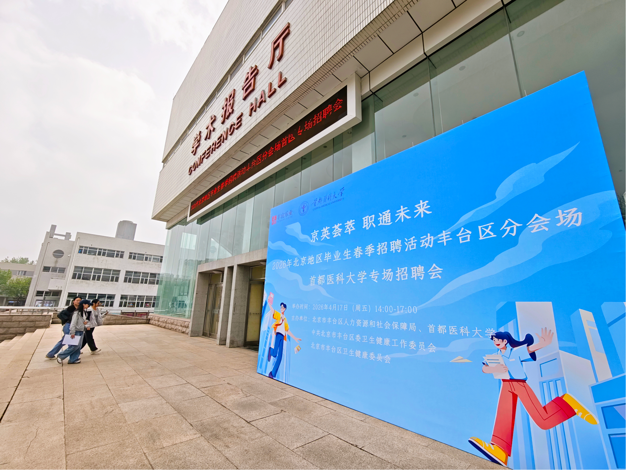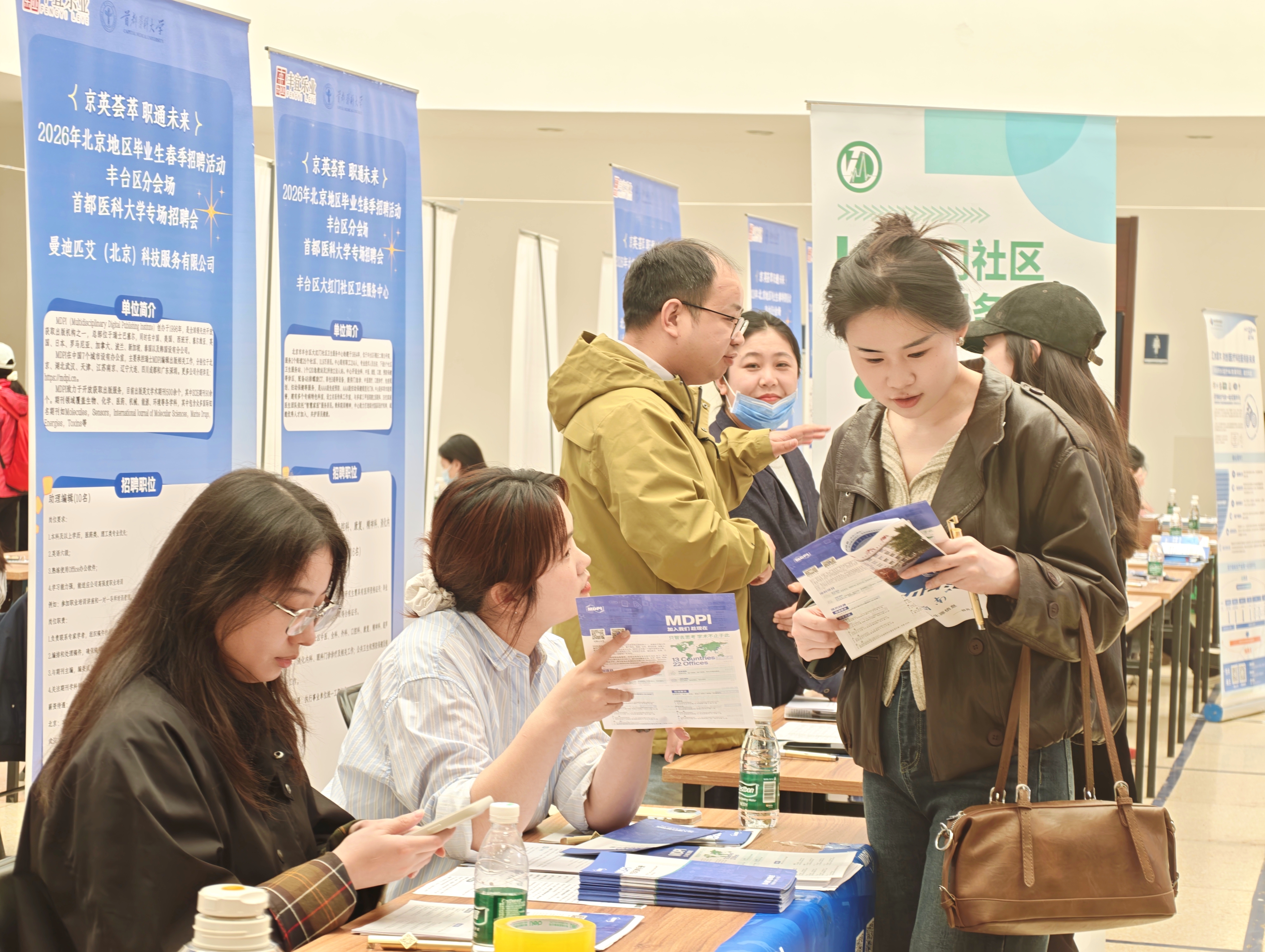 4月17日下午,由丰台区人力社保局、丰台区卫生健康委员会、首都医科大学联合举办的医药卫生专场双选会将“学完即练、练完即聘”的服务模式落到实处。北京丰台医院、北京市丰台区中医医院等35家优质企事业单位齐聚校园,带来涵盖临床医疗、公共卫生、医药研发、康复管理等多个领域的600余个岗位,高度贴合首医大各专业特点。