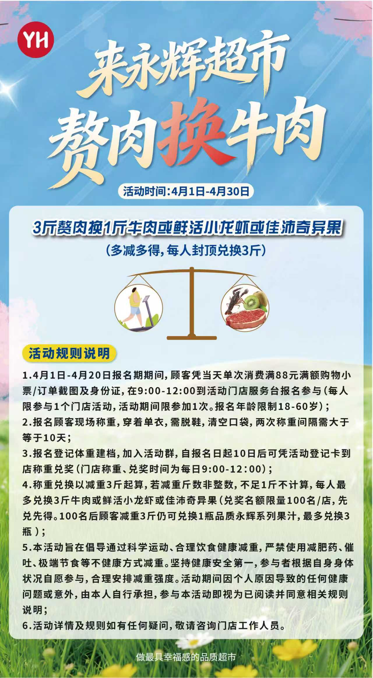 据了解,本次活动参与便捷、规则简单,消费者凭当日单次消费满88元的小票及身份证即可报名登记初始体重,10天后返店称重,每减重3斤就能兑换1斤奖品,活动自推出以来,吸引了不少市民者报名参与。