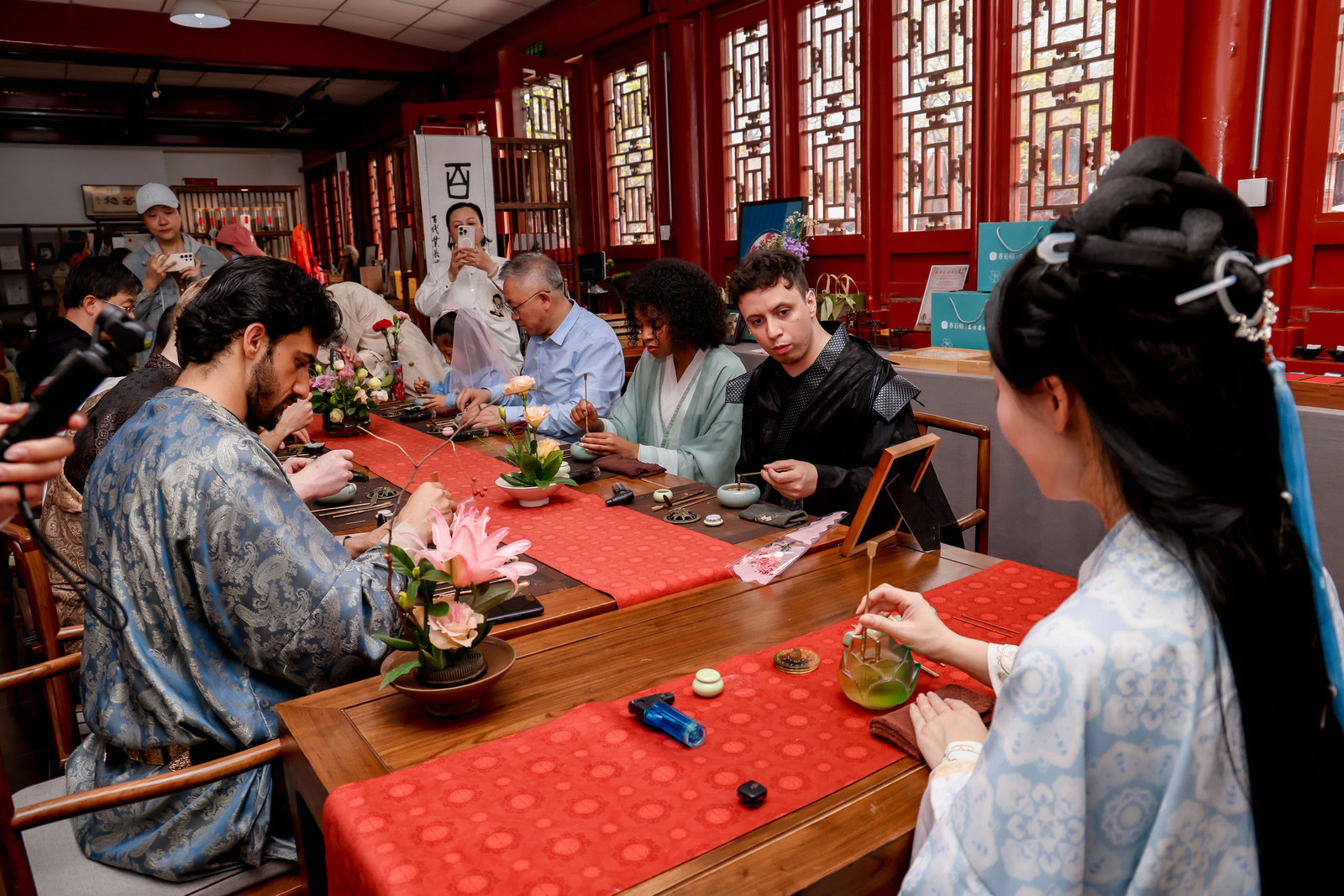 大运河文化旅游景区内,千年燃灯塔巍然矗立,塔影倒映碧波,繁花簇拥堤岸,景致美不胜收。“花潞米”春日信使携运河水韵与繁花清香亮相,身姿灵动、热情洋溢。西海子公园云曲桥上,汉服爱好者身着锦绣华服缓步而行,衣袂翩跹、古韵悠长,勾勒出副中心独具韵味的春日盛景。景区内还特别设置非遗体验环节,多位外国友人参与古法制香非遗体验,在非遗传承人的指导下,沉浸式感受中华传统香文化的独特魅力,让非遗技艺在国际交流中绽放新光彩。