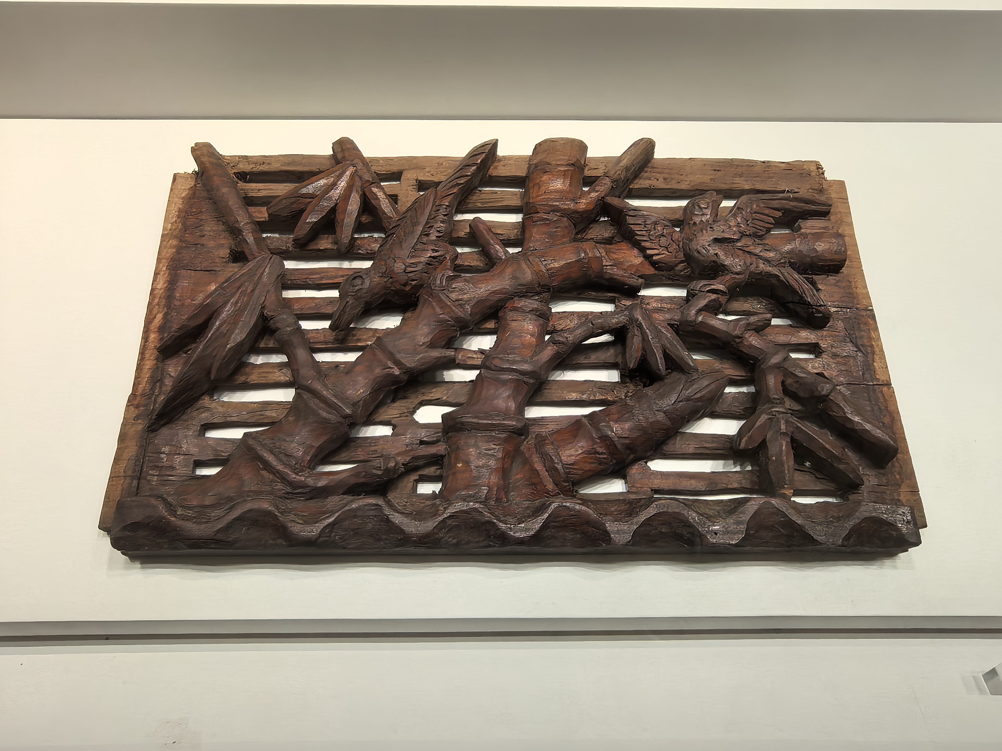 公阁楣通体用海南黄花梨木制成,长460厘米、高60厘米,由25块透雕和浮雕花板组成一幅完整的神龛罩。花板图案极为丰富:丹凤朝阳、松鹿同春、喜鹊登梅、博古纹、柳浪闻莺及各种花鸟瑞兽。在海南传统民居中,中堂后上方设置神龛,供奉祖先牌位,公阁楣便是神龛上方的大型装饰构件,是琼作木雕工艺在民俗文化中的经典运用。整件作品雕作精巧细致,大部分为透雕,地子由纵向条纹和边框连结,立体感强,有鲜明的海南地方特色。