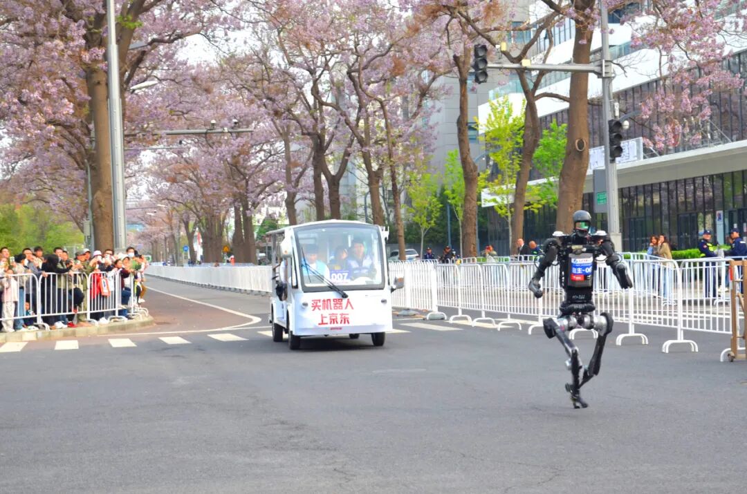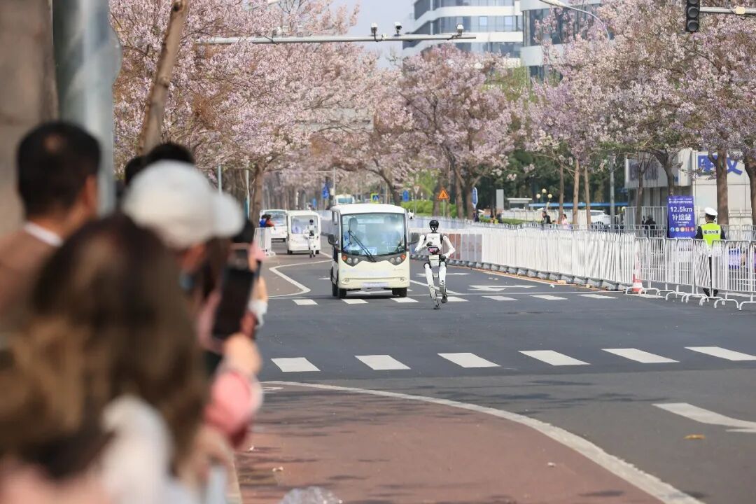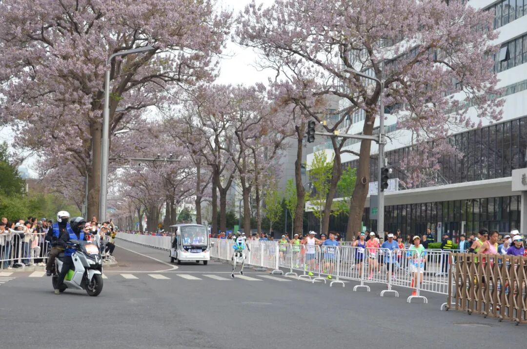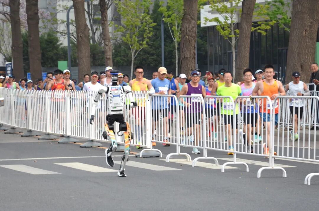 当天早上7时30分,人形机器人和跑者在起点同时鸣枪起跑,中间由隔离带安全分隔,一起参加21.0975公里的半程马拉松比赛。